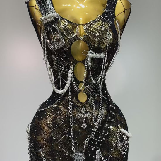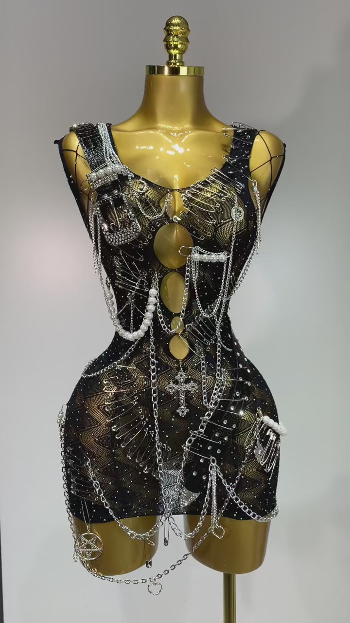 Unleash your inner rebel with the Midnight Mayhem Dress, a jaw-dropping black mesh mini that’s dripping in attitude and accessories. Featuring bold cutouts, layered chains, oversized safety pins, pearls, and statement charms—including a jeweled cross and pentagram—this dress is a full-throttle mix of punk, goth, and glam. Perfect for nightlife queens, edgy events, or unapologetic entrances. It’s not just fashion—it’s a full statement.