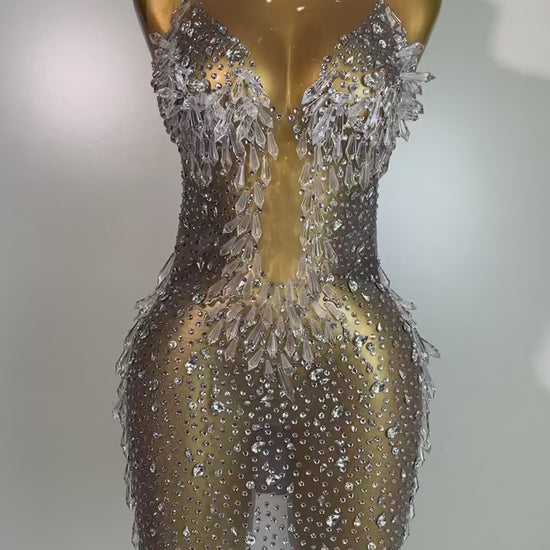 A dangerously dazzling showpiece designed to hypnotize. Crafted on a sheer nude base, this body-contouring mini explodes with a fierce arrangement of dagger-like crystals and sparkling rhinestones, creating the illusion of a shimmering flame down your curves. From spotlight entrances to jaw-dropping exits, this dress was made for fearless glam queens who don’t just shine — they strike.