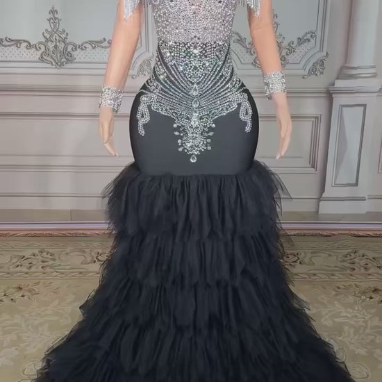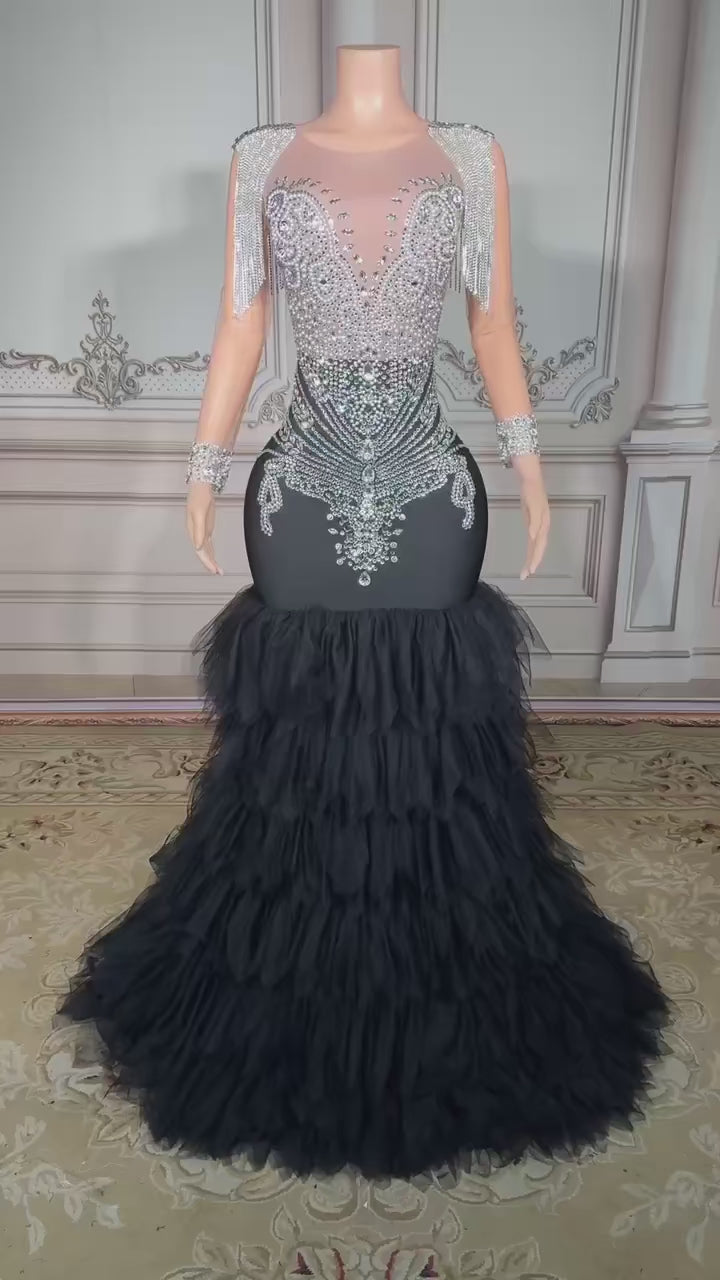 Step into pure sophistication with this masterpiece gown, designed to captivate every glance. The illusion bodice is adorned with shimmering crystal embellishments and delicate fringe details, creating a radiant sparkle with every movement. The sleek, figure-hugging silhouette flows seamlessly into a dramatic tiered tulle mermaid skirt, adding depth, drama, and red-carpet glamour. Perfect for galas, pageants, and unforgettable evenings, this gown exudes elegance, confidence, and timeless allure.