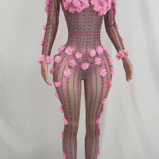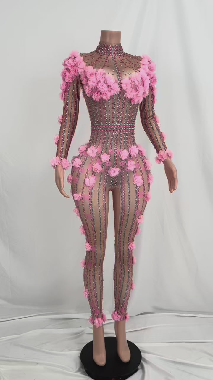 Bloom with boldness in the Blush Garden jumpsuit — a romantic showpiece that blends sensuality with springtime fantasy. This nude mesh, figure-hugging design is covered in shimmering rhinestone lines and adorned with delicate 3D pink floral appliqués. From the neckline to the ankles, every detail is crafted to highlight your silhouette and leave a trail of enchantment behind.