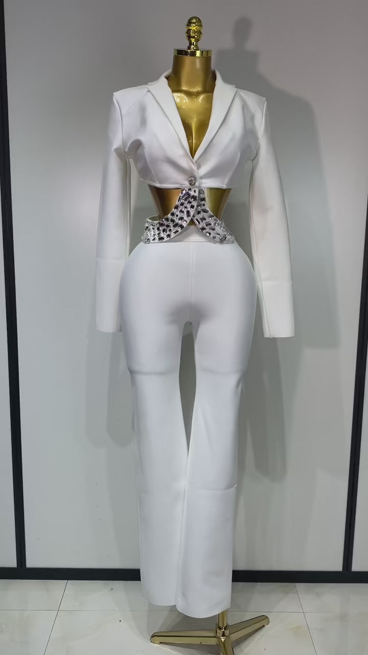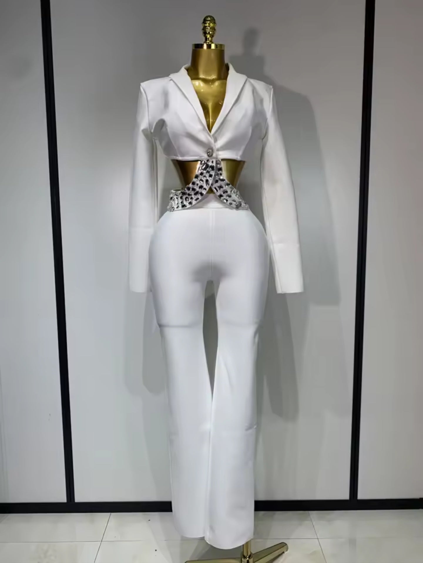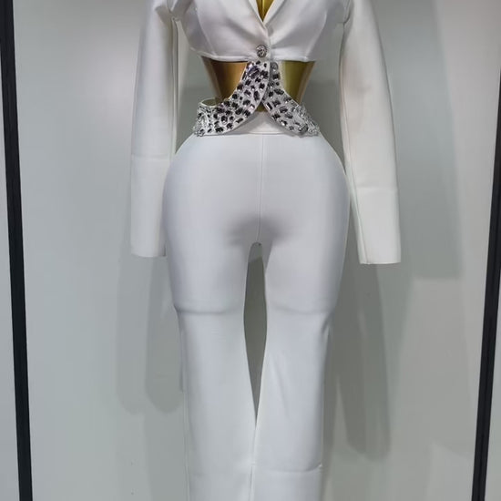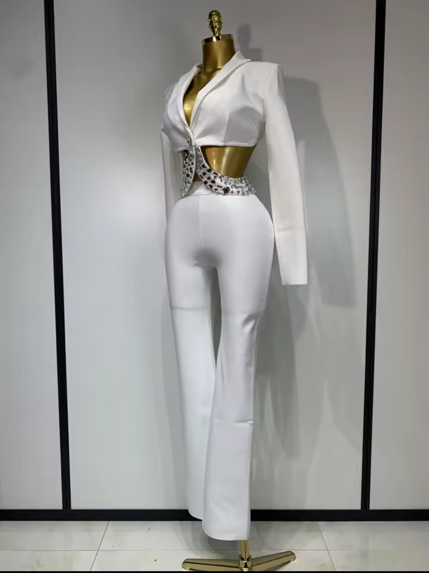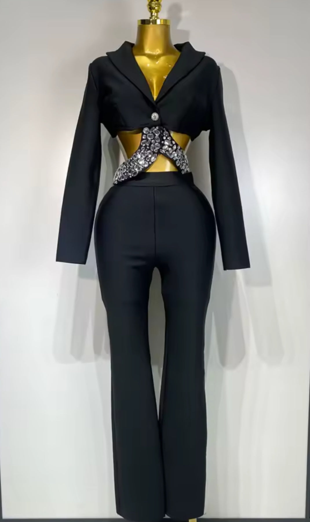 This sleek two-piece ensemble features a sharp-shouldered cropped blazer with a plunging neckline and a bold center cutout, cinched at the waist with dazzling silver crystal embellishments. The high-waisted flared pants elongate the silhouette, offering a statuesque finish that blends boss energy with red-carpet glamour. Polished, powerful, and unapologetically sexy — this suit is made for the woman who owns every entrance.