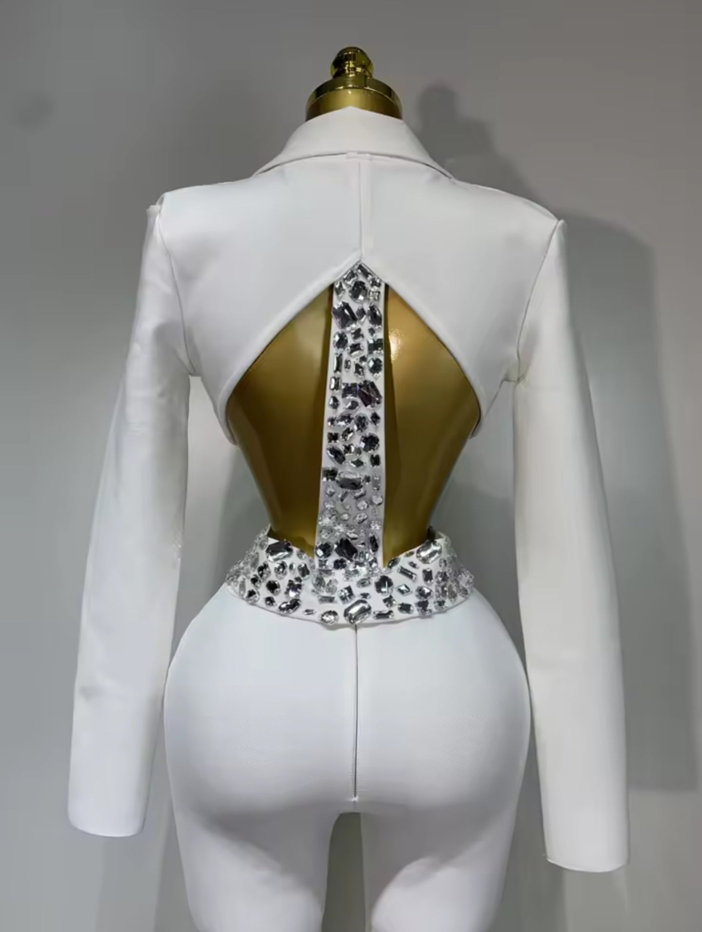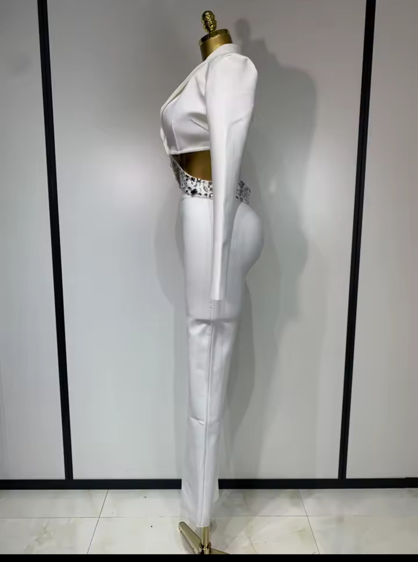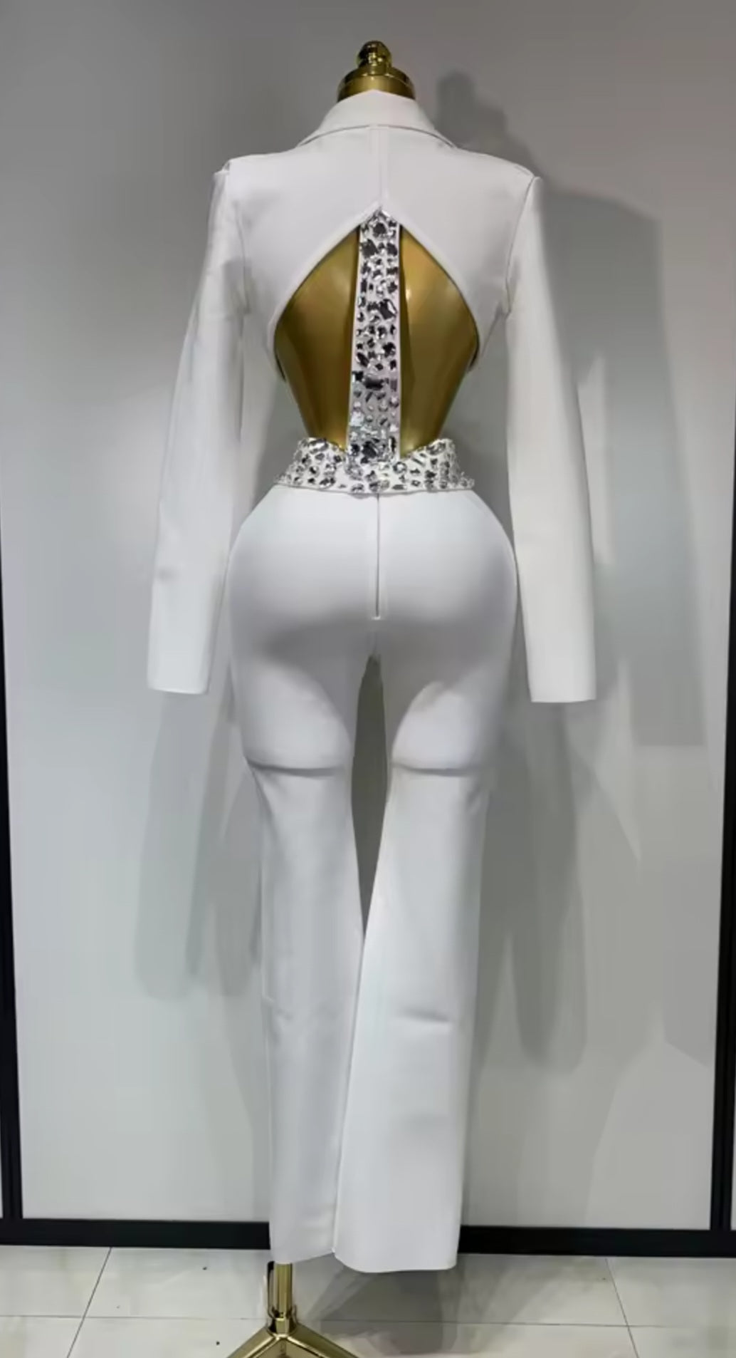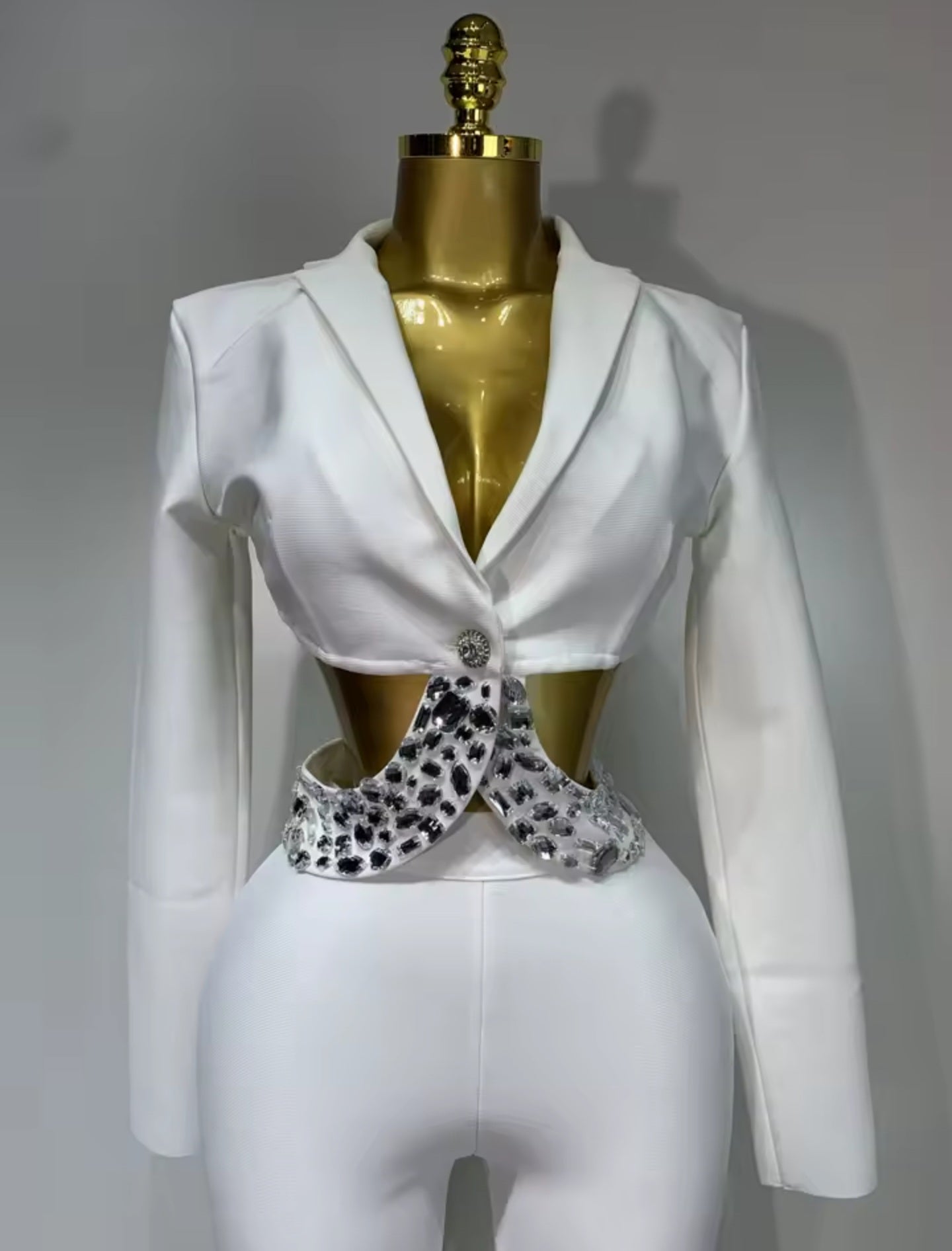This sleek two-piece ensemble features a sharp-shouldered cropped blazer with a plunging neckline and a bold center cutout, cinched at the waist with dazzling silver crystal embellishments. The high-waisted flared pants elongate the silhouette, offering a statuesque finish that blends boss energy with red-carpet glamour. Polished, powerful, and unapologetically sexy — this suit is made for the woman who owns every entrance.