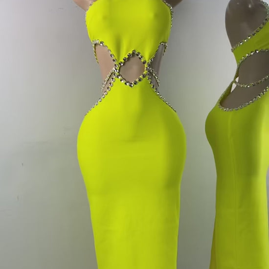 Step into bold brilliance with our Citrus Blaze midi dress — a radiant, curve-hugging statement in electric lemon yellow. Featuring dazzling rhinestone-lined diamond cutouts at the waist and an elegant halter neckline, this piece strikes the perfect balance between fierce and feminine. Whether you're commanding the room at a rooftop party or lighting up the dance floor, this dress ensures all eyes stay on you. Be bright. Be bold. Be unforgettable.
