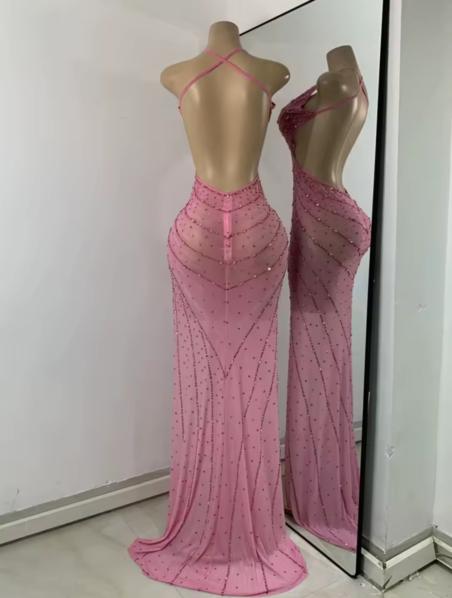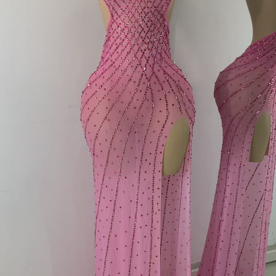 Radiate elegance and allure in this stunning blush pink rhinestone gown. Featuring a sculpted halter neckline and sultry side cutouts, this body-hugging design is adorned with sparkling stone patterns that cascade like liquid shimmer. The high slit adds a daring touch of drama, while the sheer flow and subtle train create a graceful, show-stopping silhouette.