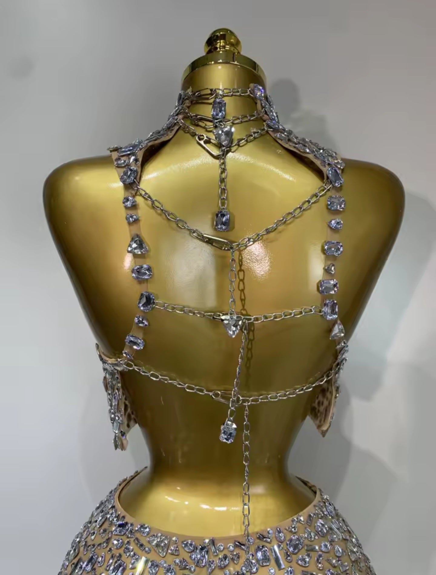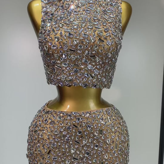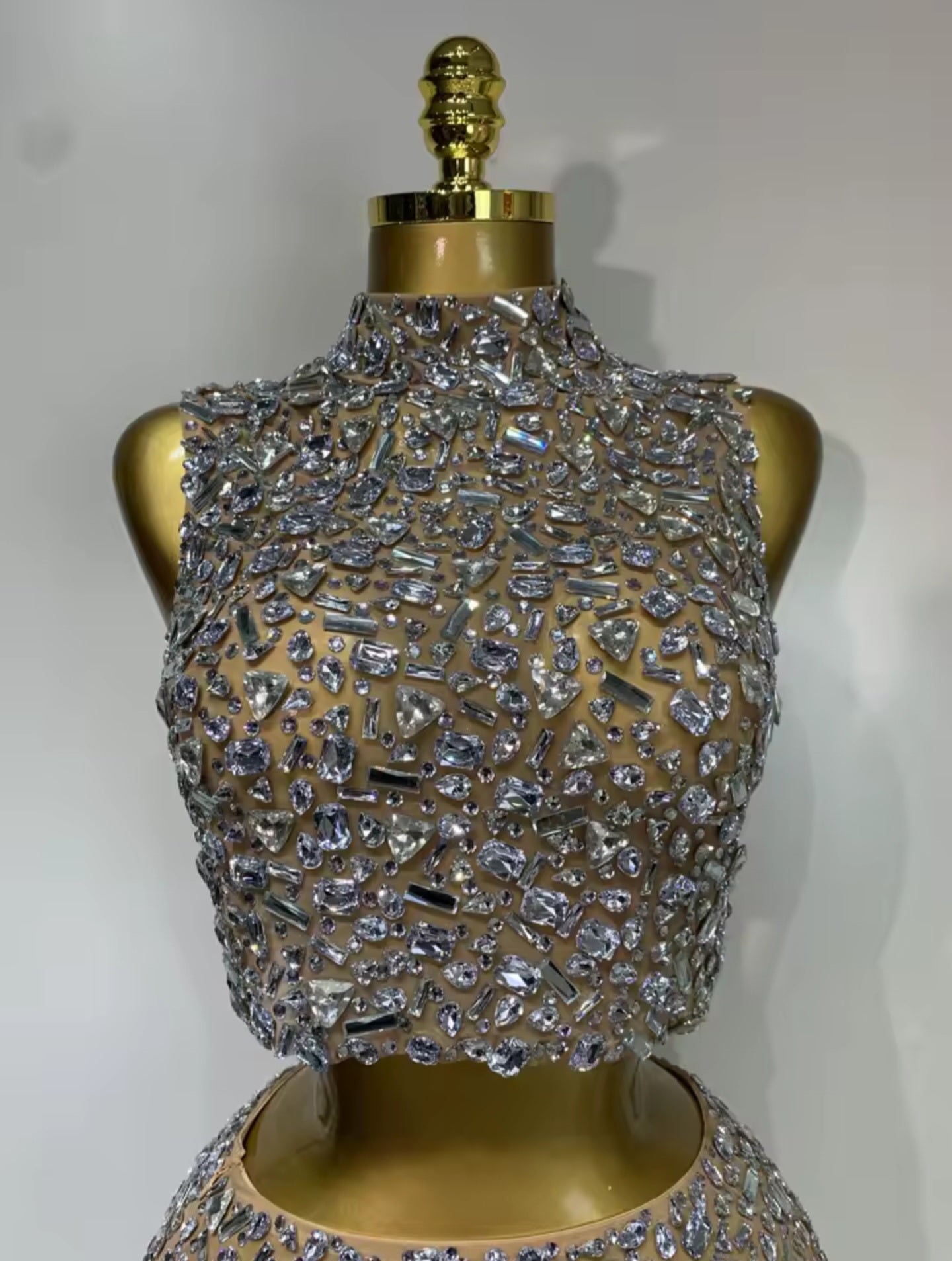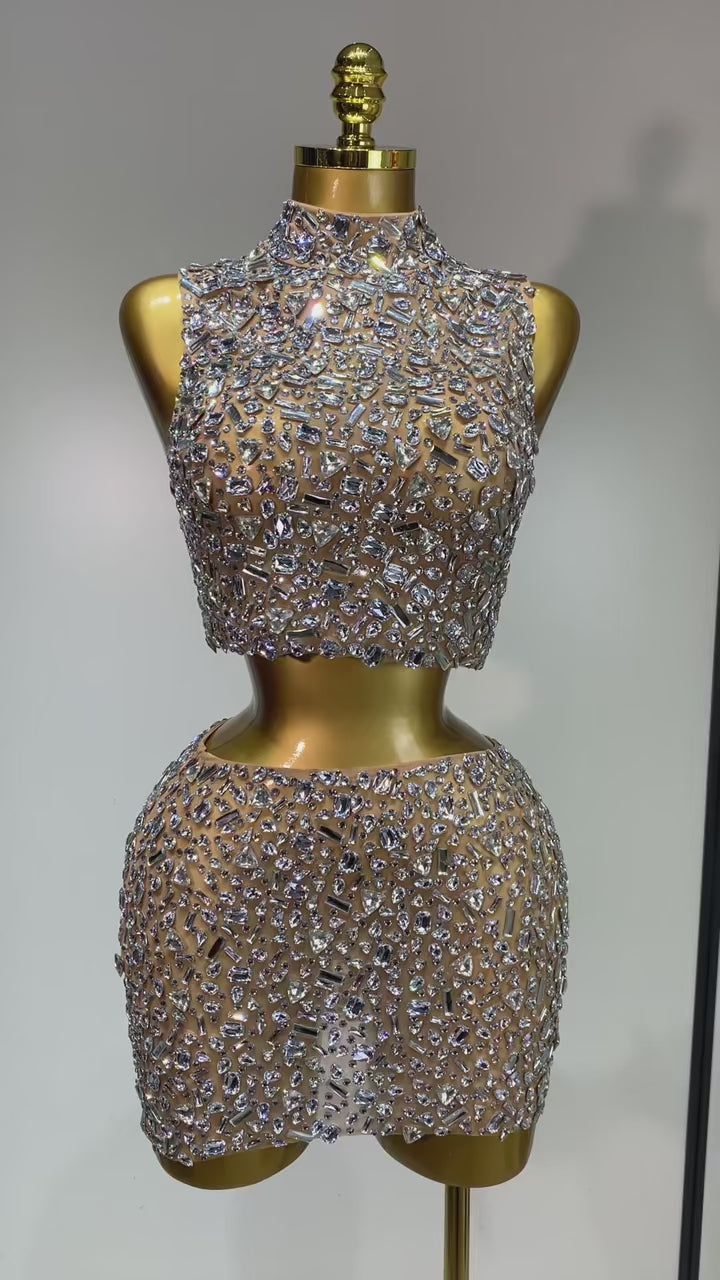 The Crystal Mirage Skirt Set is a dazzling two-piece ensemble designed for the woman who owns the spotlight. Featuring a high-neck cropped top and a fitted mini skirt, this nude mesh masterpiece is covered in a constellation of radiant crystals that shimmer from every angle. Sexy, sophisticated, and utterly unforgettable—this set is made for red carpet moments, exclusive parties, and nights you’ll never forget.