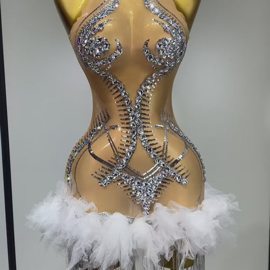 Command the spotlight in our Crystal Swan Fantasy mini dress—a breathtaking blend of sheer illusion, hand-embellished crystal appliqués, and a flirty white feathered hem. This haute couture piece drips in luxury, with silver fringe that dances with every step. Perfect for show-stopping events, performances, or when you simply want to slay unapologetically.