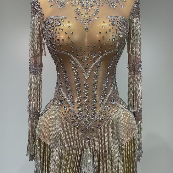 Step into the spotlight with the Crystal Temptation Illusion Playsuit — where high fashion meets pure enchantment. Crafted on a sheer nude base, this body-hugging masterpiece is drenched in radiant rhinestones and shimmering crystals, artfully placed to enhance your curves.