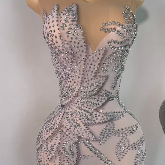 Dare to be unforgettable in the Crystal Vines Illusion Dress — where elegance meets seductive edge. This full-length, body-contouring masterpiece is adorned with a breathtaking array of silver rhinestones in intricate vine-like patterns that cascade down a sheer nude base, creating a second-skin illusion. A plunging neckline and high-curve silhouette sculpt the body to perfection, while strategic sparkle adds just the right touch of glam.
