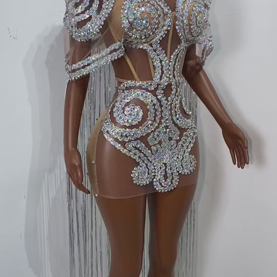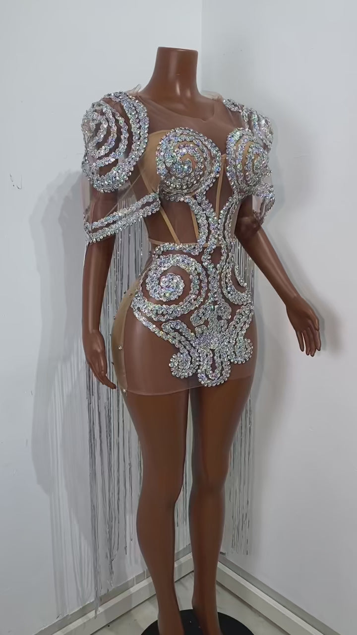 Show-stopping piece designed for the bold and unapologetically sexy. Adorned with swirling rhinestone patterns, daring cutouts, and dramatic shoulder accents with cascading fringe, this dress delivers an electrifying blend of glamour and edge. Perfect for the stage, spotlight events, or unforgettable nights out — it’s not just a dress, it’s a declaration.
