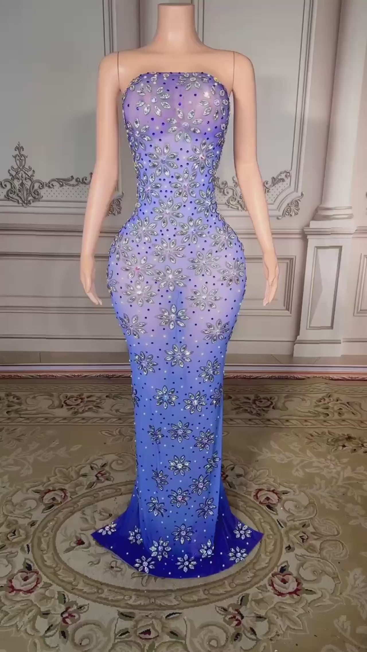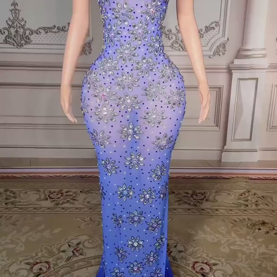 This blue sheer crystal dress adds a touch of elegance and glamour to any occasion. The sheer material allows for subtle glimpses of skin, while the intricate crystal detailing catches the light for a dazzling effect. Perfect for making a statement and standing out in any crowd.