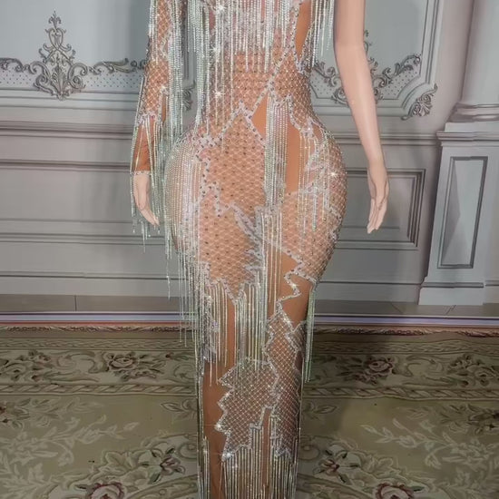 Dazzle your way into the spotlight with this jaw-dropping crystal fringe dress. Designed with a nude illusion base, this body-hugging masterpiece is encrusted with shimmering rhinestones and dripping in cascading silver fringe. The asymmetrical long sleeve adds a bold twist, while the intricate geometric detailing enhances every curve. Perfect for high-glam events, stage performances, or unforgettable entrances—this dress is pure drama, elegance, and sparkle in one unforgettable look.