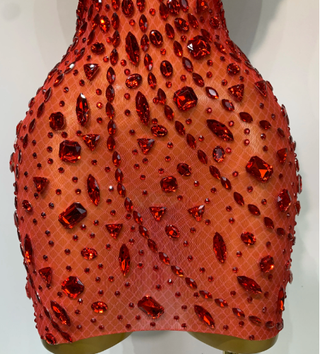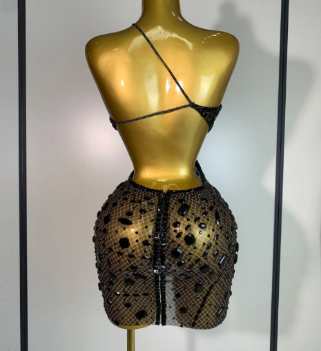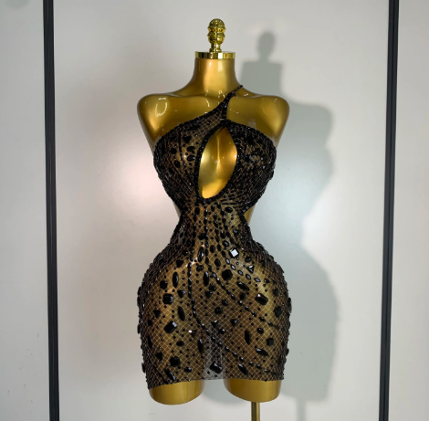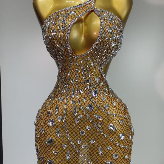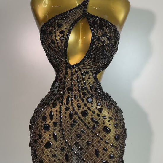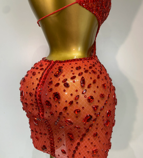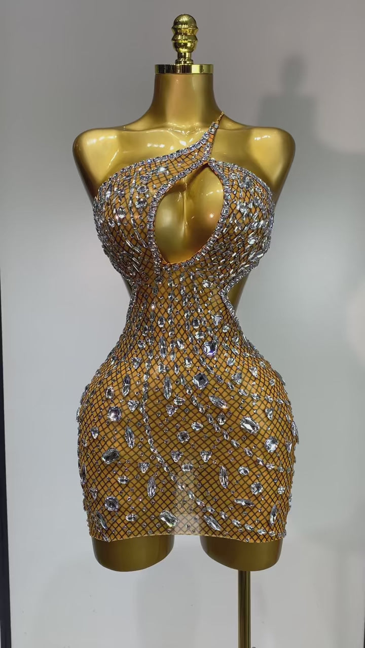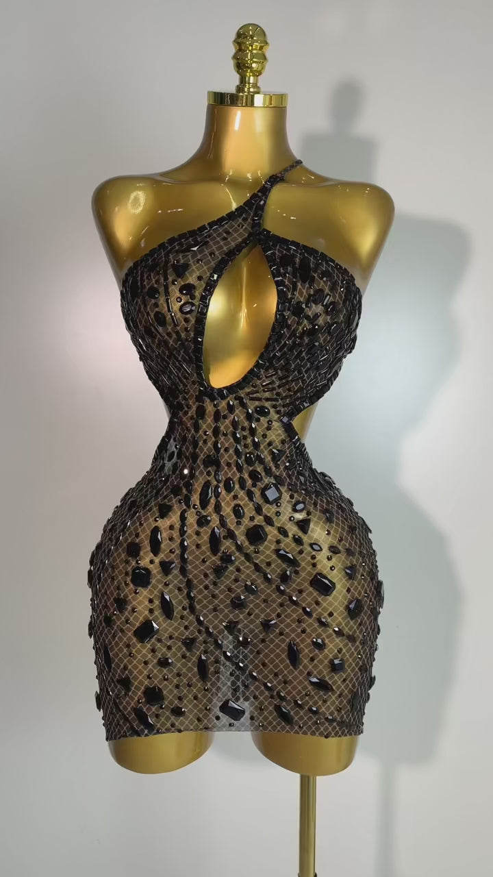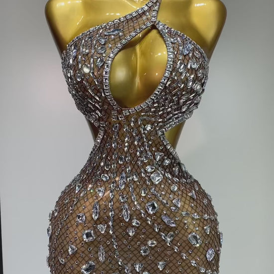 Make a bold statement in this daring sheer dress, dripping with dazzling diamond-like embellishments. Designed to turn heads, its revealing silhouette and sparkling details exude confidence and fearless glamour for unforgettable experience.