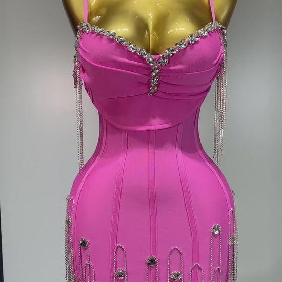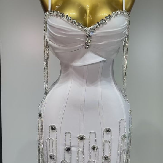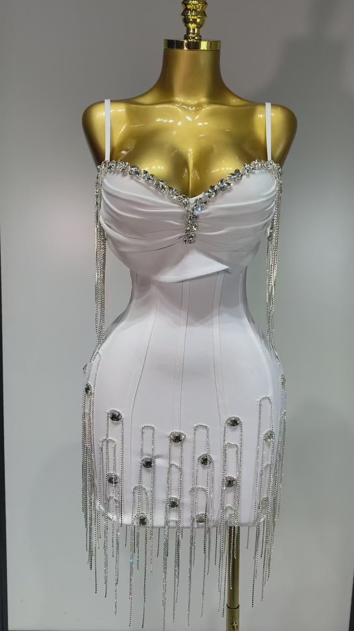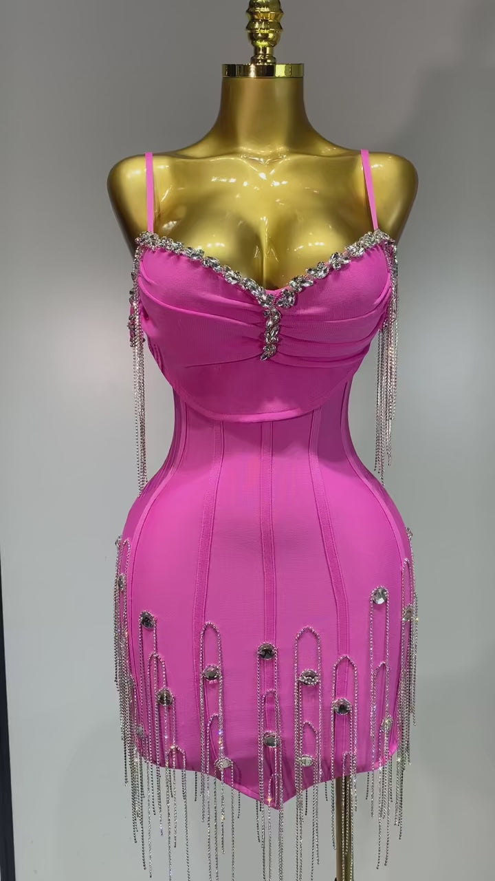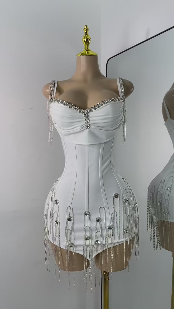 Sophistication meets sparkle in the Diamond Drip Corset Mini Dress — a sultry silhouette designed to steal the spotlight. Crafted in a flattering sweetheart neckline, this body-hugging mini features delicate crystal straps, a structured corset bodice, and dazzling rhinestone fringe that cascades from the hemline like liquid diamonds. Jewel embellishments add extra glitz, making every angle shimmer.