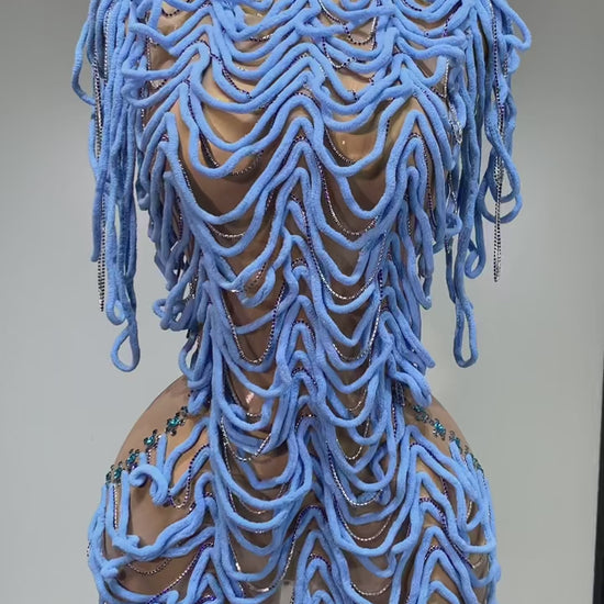 A show-stopping statement piece that redefines texture and temptation. Featuring soft periwinkle draping over a sheer nude base, this sculpted mini plays with fluidity and edge. The layered, wave-like strands create a mesmerizing silhouette that’s equal parts futuristic and seductive. Perfect for fashion-forward icons who love to turn chaos into couture.
