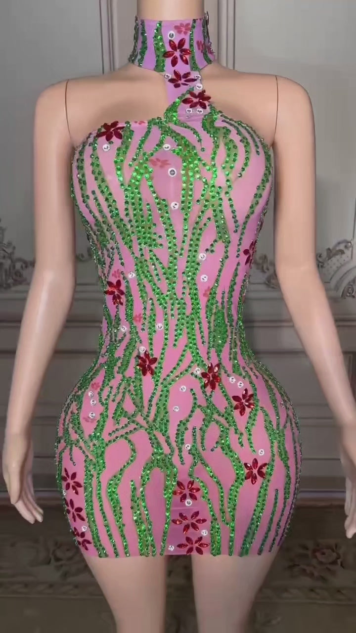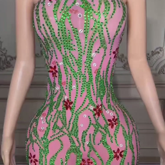 Crafted on a soft blush base, the dress is lavishly adorned with hand-set green crystal vines and shimmering red floral appliqués, creating the illusion of a blooming garden that sparkles with every move. The high-neck halter cut flows into a sculpted, body-hugging silhouette that celebrates every curve with elegance and drama. Perfect for galas, birthdays, or nights where standing out is the only option, this piece is more than a dress—it’s wearable art.