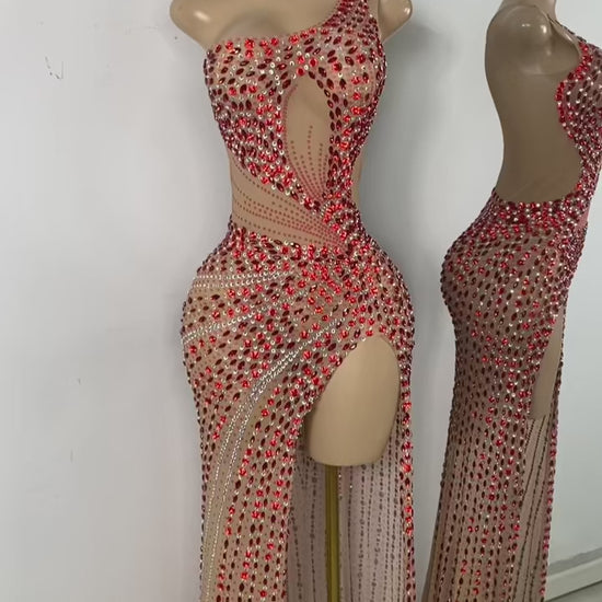 Designed with a sheer nude base and drenched in fiery red crystals, it hugs every curve while creating an illusion of sparkle and sophistication. The asymmetric neckline, sculpted cut-outs, and high slit bring together sultry drama with red-carpet elegance, making it the ultimate show-stopping piece for women who love to be unforgettable. Perfect for birthdays, galas, and once-in-a-lifetime nights, this gown transforms you into the star of the room the moment you arrive.