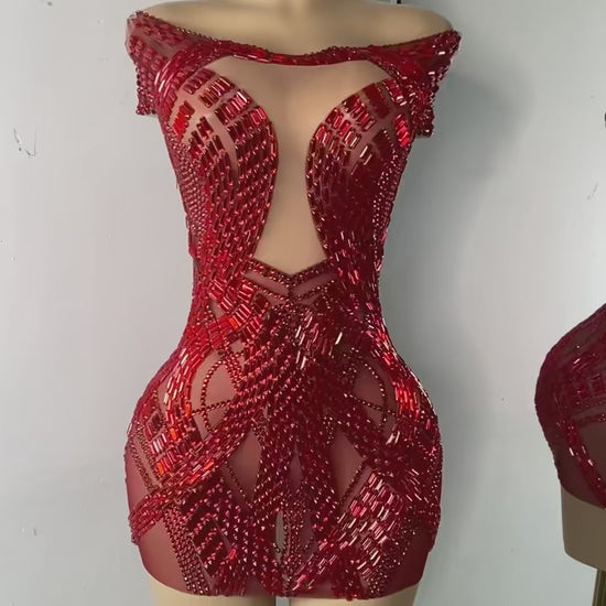 Command the room in the Fire and Faucet Mini Dress, a daring off-the-shoulder masterpiece encrusted with intricate red beading over sheer illusion mesh. This sultry silhouette hugs every curve with strategic cutouts and bold design, blending seduction with high fashion. Perfect for red carpet entrances, VIP nights, or when you refuse to be anything but unforgettable.