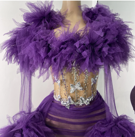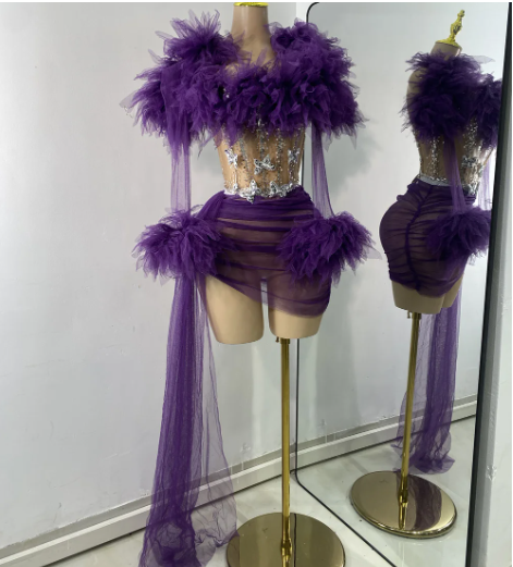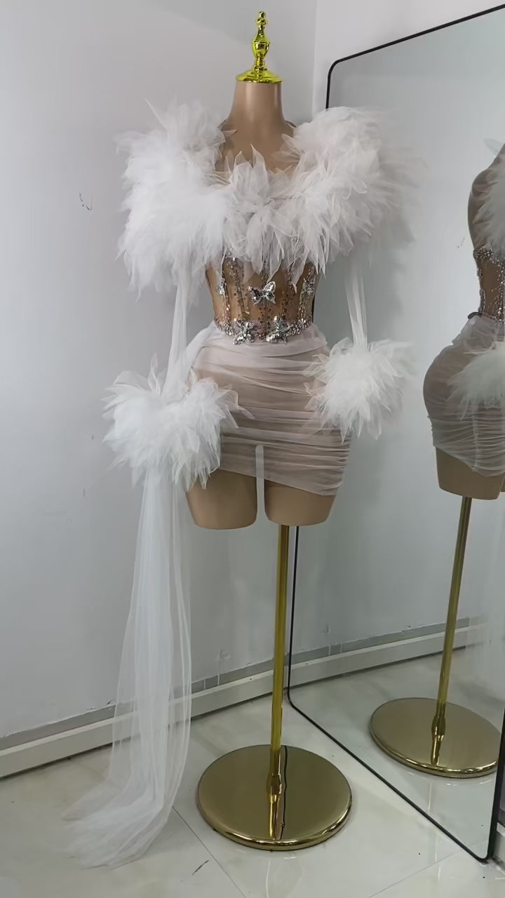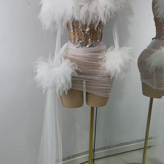 Turn heads in the Frosted Luxe mini Skirt Set — a high-drama, high-fashion masterpiece that commands attention. This daring sheer mini set features a crystal-studded nude bodice with silver embellishments that shimmer like freshly fallen snow. Feathered tulle detailing envelops the neckline and wrists, offering a cloud-like softness that balances its bold silhouette. The ruched mesh skirt hugs every curve, while cascading tulle streamers at the sleeves add flow and fantasy with every movement.