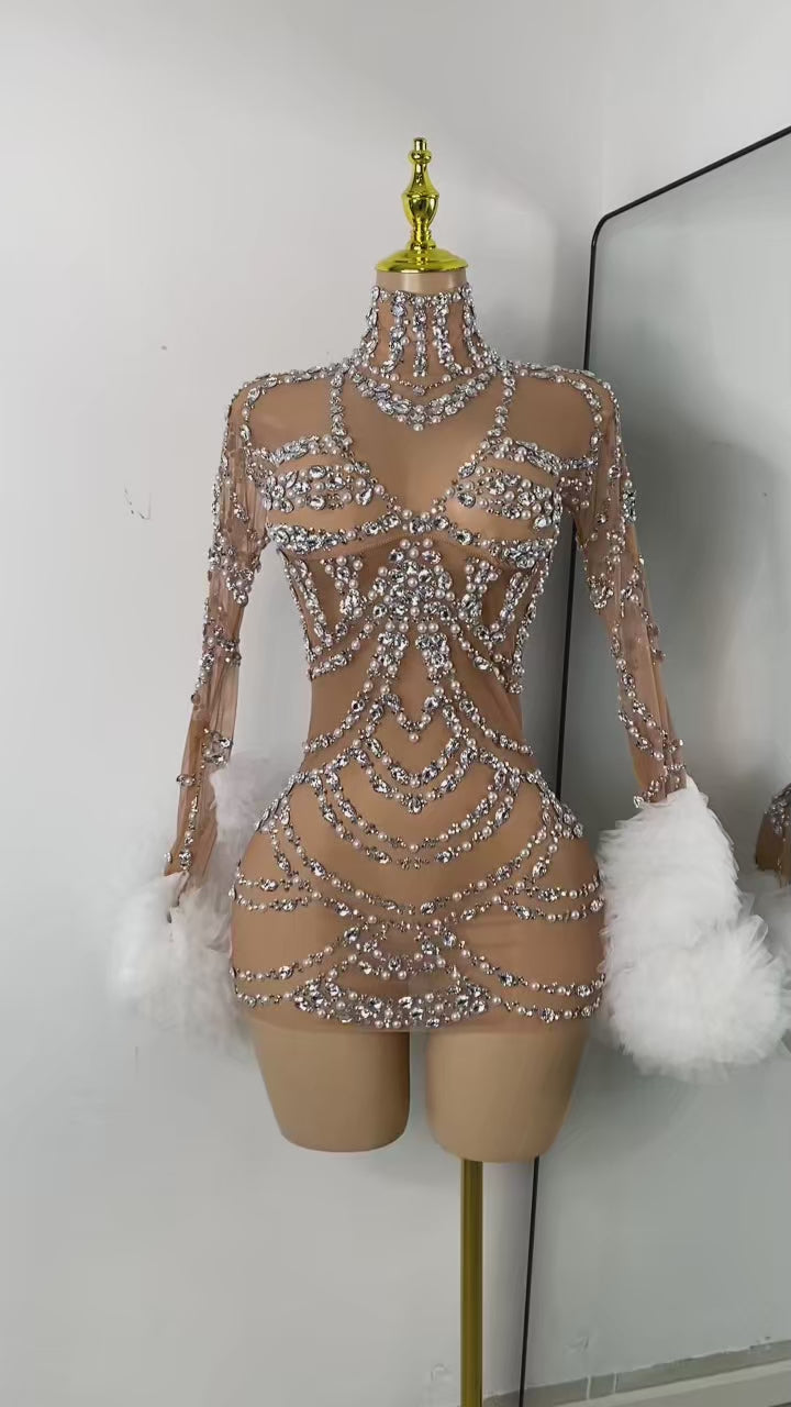 Step into pure opulence with this hand-embellished masterpiece. Crafted on a sheer nude base, this couture design is drenched in cascading crystals and luminous pearls, creating the illusion of jeweled armor. The high neckline and long sleeves add dramatic elegance, while the intricate beadwork sculpts the body in shimmering curves. Perfect for show-stopping entrances, red-carpet moments, or luxury soirées, this piece embodies fearless glamour and unapologetic extravagance.
