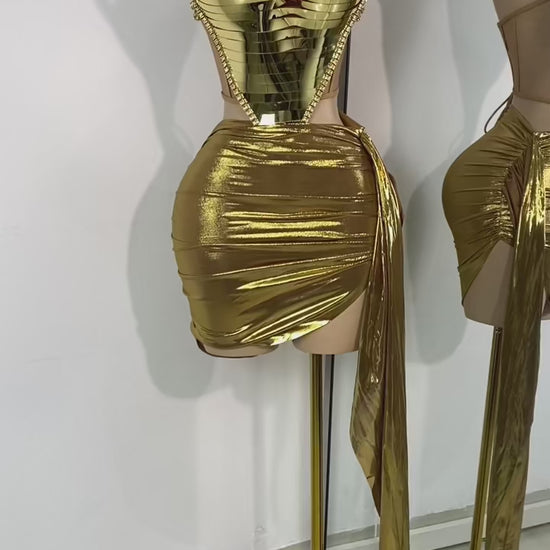 A jaw-dropping metallic gold mini dress that fuses ancient goddess energy with futuristic glam. Featuring a sculpted corset bodice with chain embellishments and a dramatic side-drape finish, this showstopper hugs your curves and demands the spotlight. Perfect for red carpet nights, high-glam parties, or anywhere you plan to outshine the stars