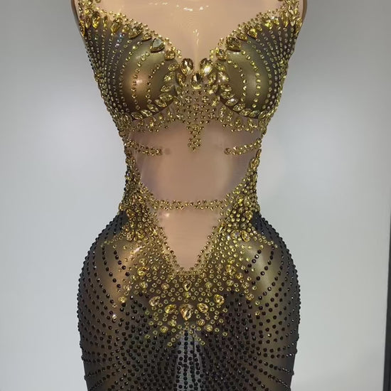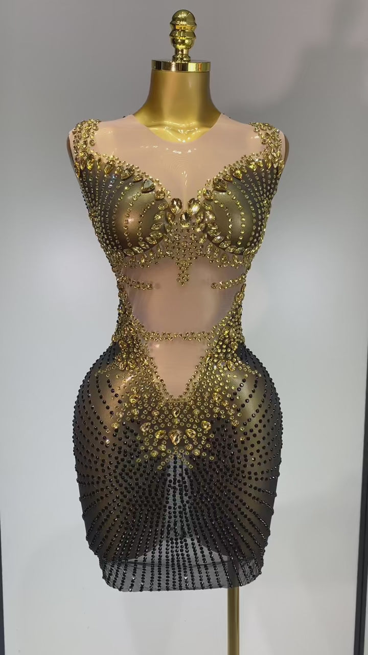 Dare to captivate in the Golden Eclipse dress — a luxurious illusion mesh creation that hugs every curve with fierce elegance. Embellished with radiant gold and onyx rhinestones, this show-stopping mini dress features a sheer nude base that gives the appearance of floating jewels across the body. The sculpted bodice is designed with a radiant sunburst of gold crystals, while the hips shimmer with cascading black stones, creating a dramatic hourglass silhouette.