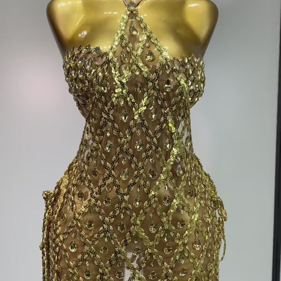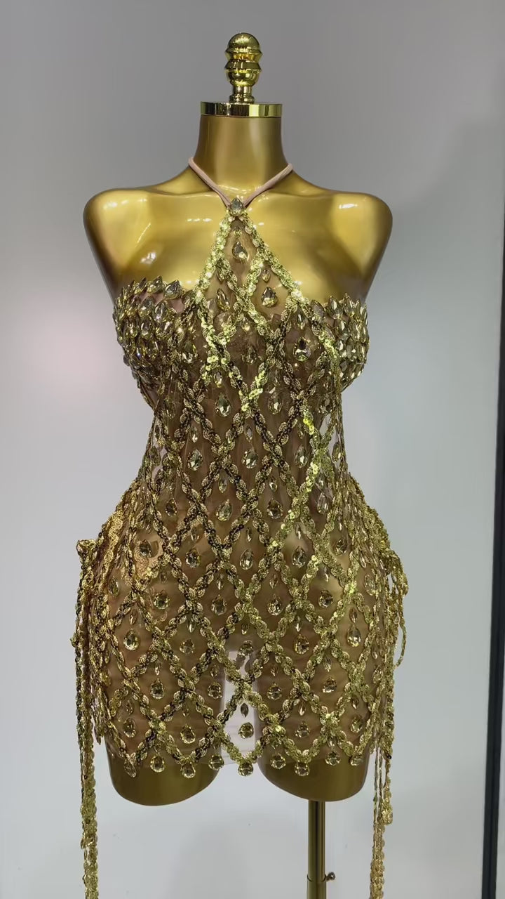 The Golden Goddess Dress is your ultimate showstopper—crafted for those who don’t just walk into a room, they command it. This halter mini features a mesh base drenched in oversized gold crystals, creating a radiant lattice of shimmer and seduction. With its asymmetric neckline and sultry draped chains, this piece is pure opulence in motion. Perfect for VIP nights, luxe birthday looks, or your next headline-making entrance.