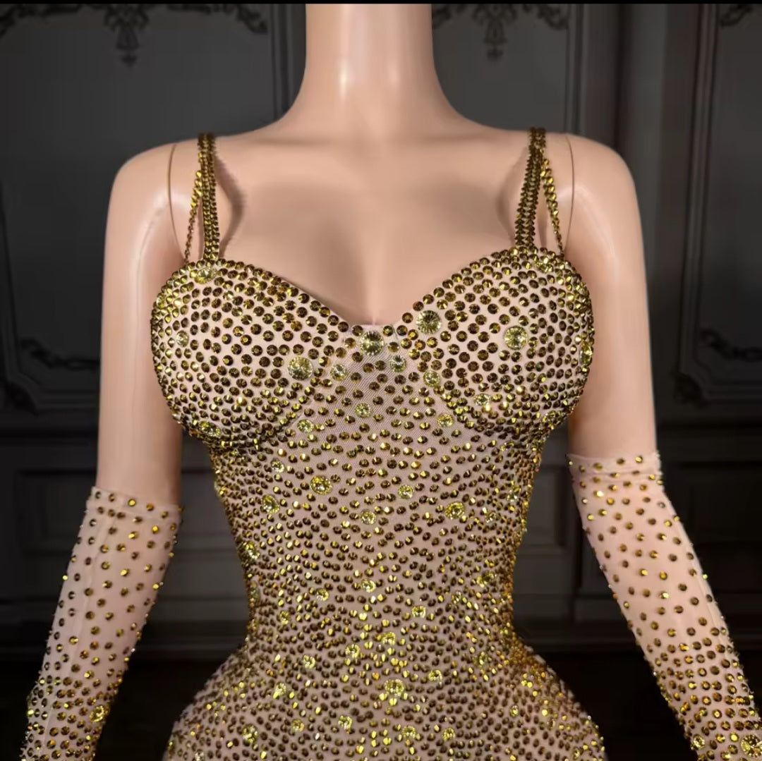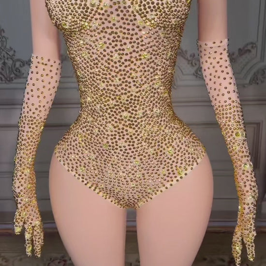 Crafted with intricate crystal embellishments that shimmer from every angle, it’s designed to hug your curves and command attention. The structured bustier neckline and high-cut silhouette create a sultry, sculpted fit, while the matching rhinestone gloves add a dramatic finishing touch. Perfect for performances, luxe parties, or making a bold statement, this piece exudes pure star power and unapologetic glamour.