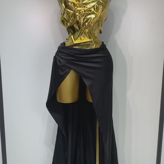 Featuring a sculpted metallic gold bodice that mimics molten elegance, paired with a luxurious black satin drape that cascades into a dramatic floor-length silhouette—this gown is pure artistry. With a high slit to flaunt your power and contrast textures that exude richness, this look is made for galas, premieres, and unforgettable entrances.