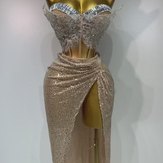 Exude timeless elegance with the Golden Romance Draped Skirt Set — a captivating blend of sparkle, sensuality, and couture detail. The strapless bodice features intricate lace embroidery with shimmering crystal accents, delicately sculpted into a butterfly silhouette that flatters and defines. A soft, sequined golden skirt wraps gracefully at the waist, forming a sultry thigh-high slit that adds just the right amount of drama.