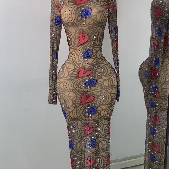 The Hearts of Fire Dress is a fearless fusion of bold elegance and sultry allure. Crafted with a sheer illusion base, it’s adorned with striking red heart appliqués, shimmering sapphire embellishments, and intricate patterns that captivate the eye from every angle. Its body-hugging silhouette and floor-length finish sculpt the figure with unapologetic confidence. Perfect for high-fashion soirées, red-carpet moments, or nights when you want all eyes on you, this gown is a statement of love, power, and undeniable glamour.