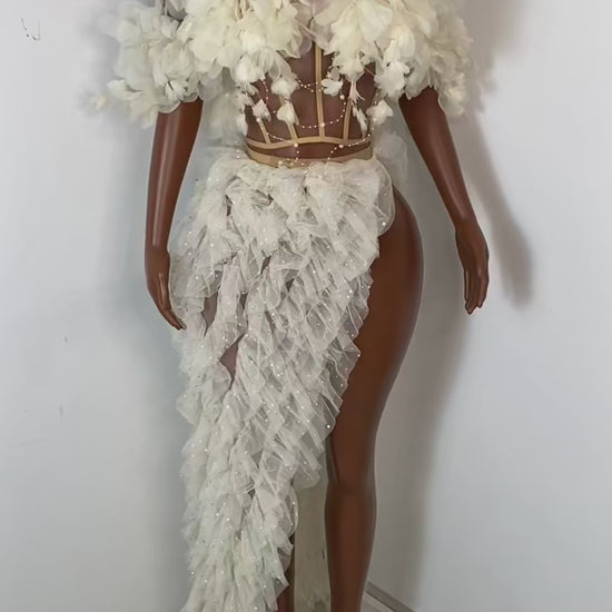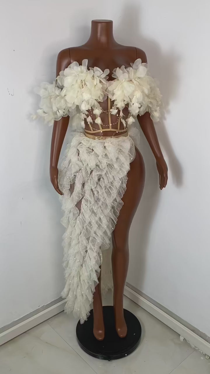 Unveil your ethereal side with the Ivory Bloom Skirt Set—a couture-inspired masterpiece featuring a structured floral bustier adorned with cascading petals and a dreamy, asymmetrical ruffled skirt. Designed for the bold romantic, this set blends whimsical textures with daring elegance, making it perfect for runway moments, editorial shoots, or unforgettable entrances.