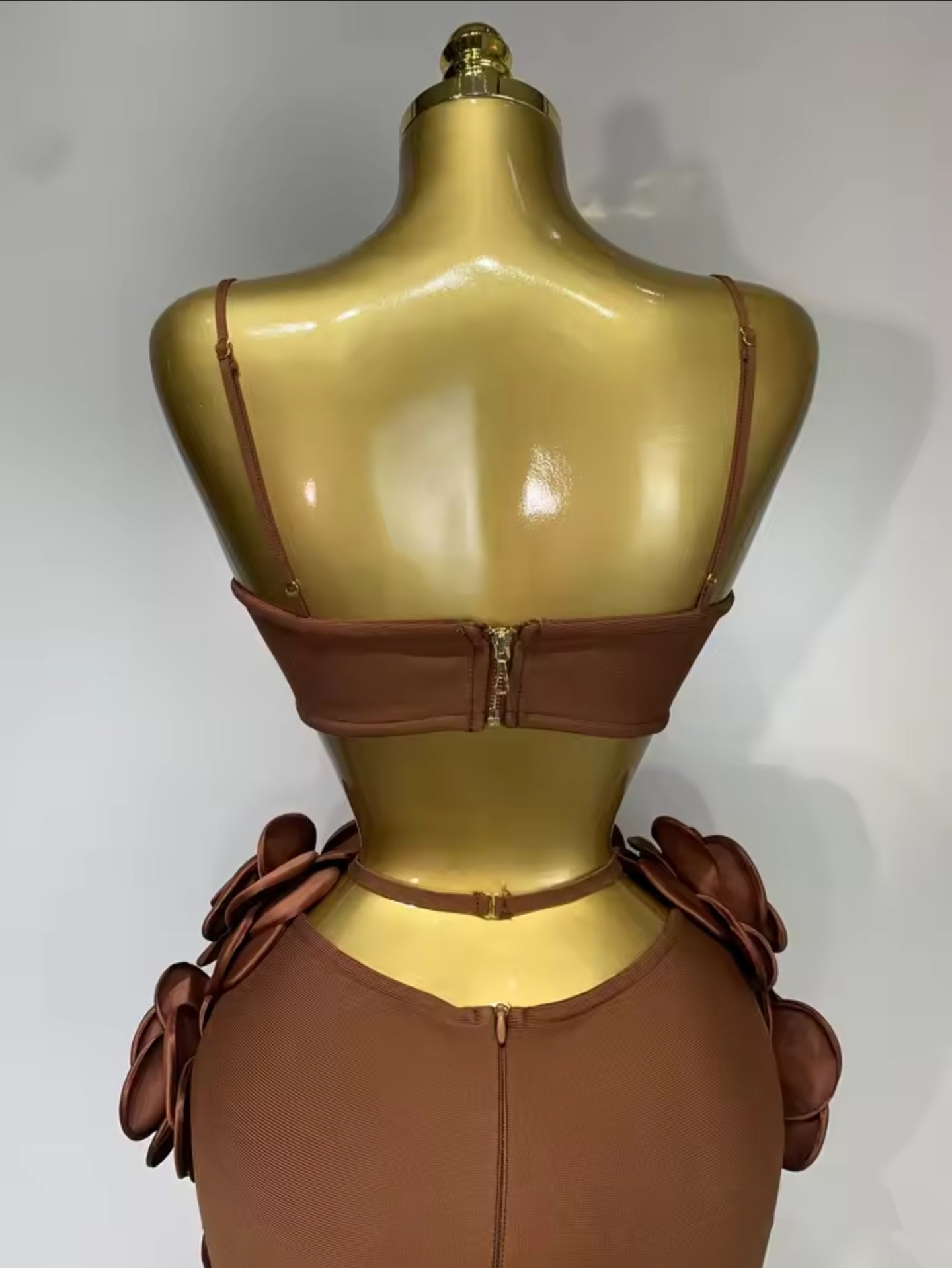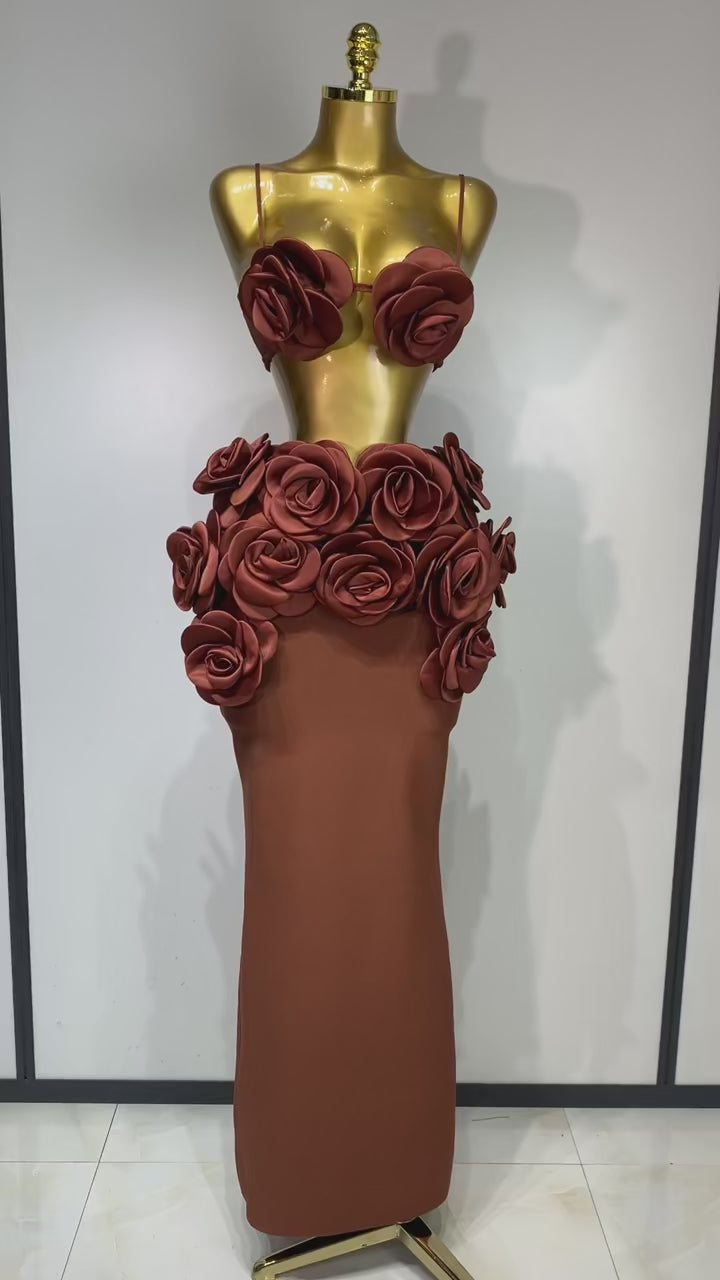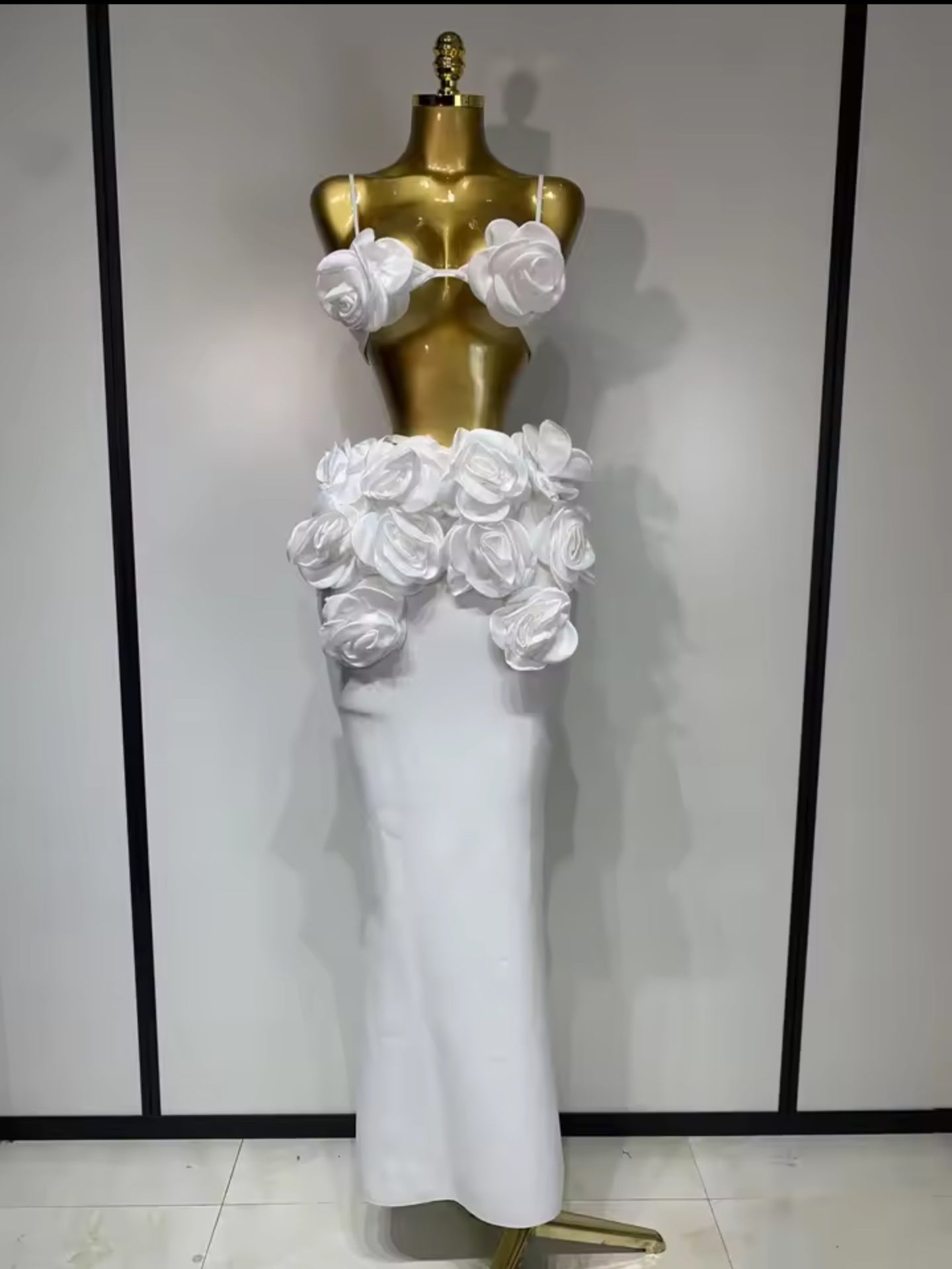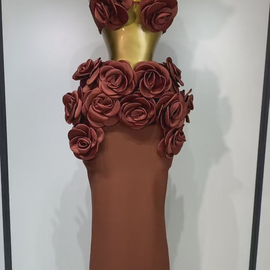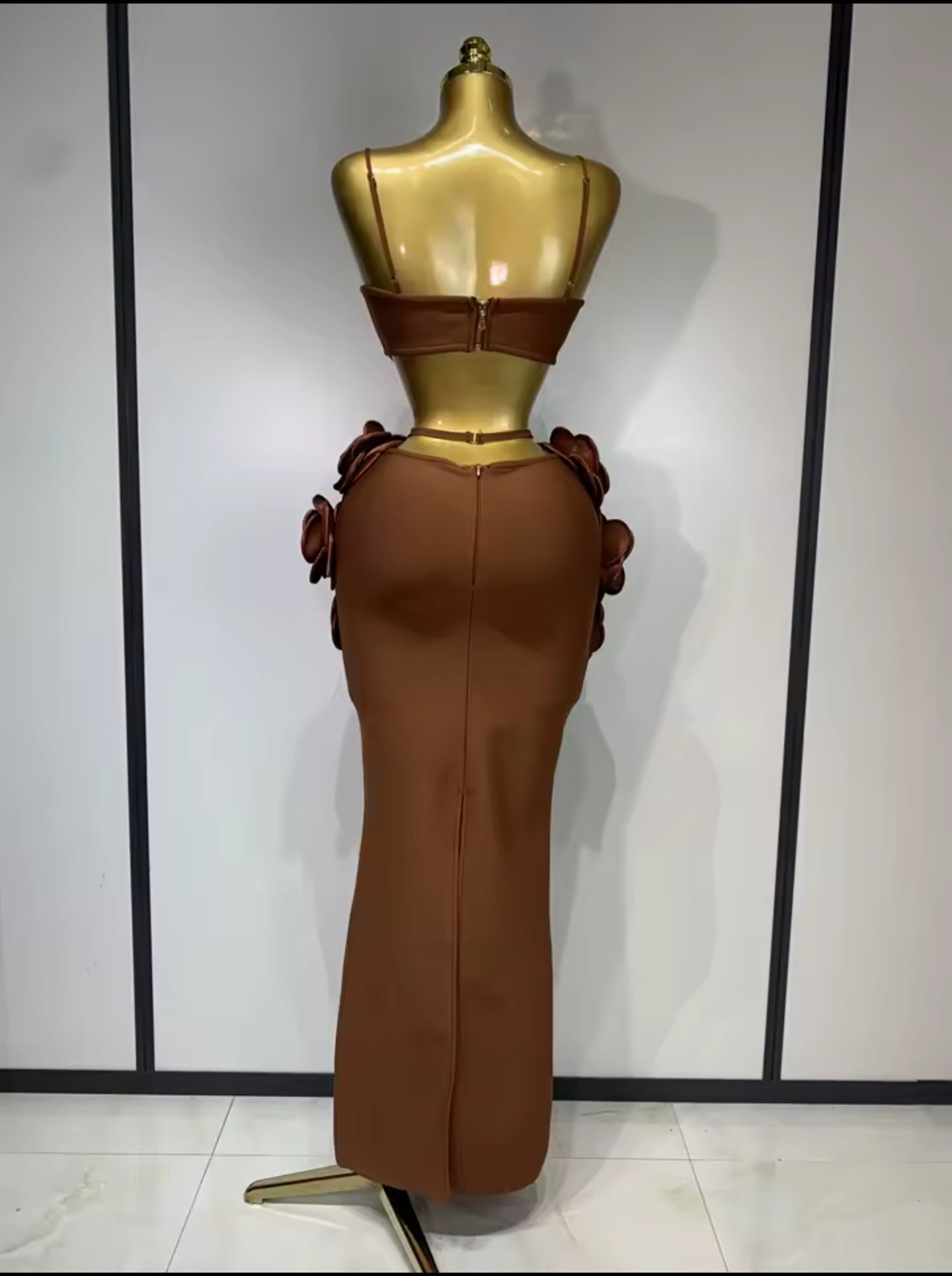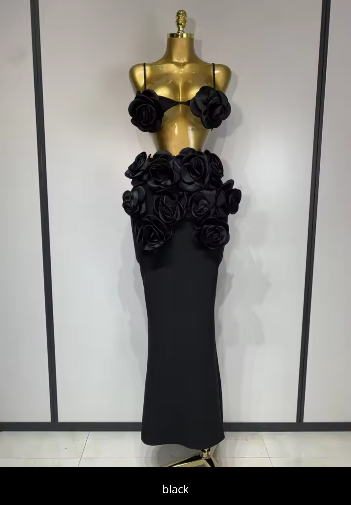 Step into the spotlight like a walking work of art in the Kellie Rose Garden Skirt Set. This captivating silhouette that hugs the body in rich toned fabric, blooming with oversized 3D roses that flourish across the bust and hips. The structured floral appliqués bring couture drama and femininity, while the sleek, floor-length skirt balances the look with modern elegance. Romantic, bold, and unapologetically unique — this set is made for red carpets, runways, or unforgettable entrances.