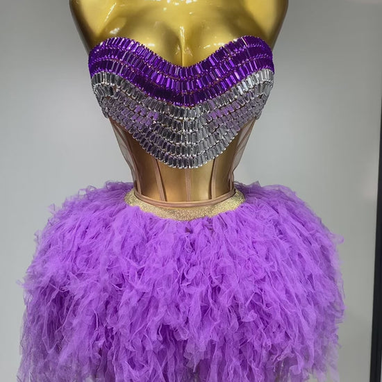 Turn fantasy into fashion with the Lilac Stardust Mini Tulle Skirt Set, a dreamy show-stopper that’s made for magical nights. Featuring a dazzling strapless bodice with layered purple and silver embellishments, this dress shines with every move. The voluminous lilac feathered tulle skirt adds a playful, ballerina-inspired twist that’s flirty and unforgettable. Perfect for birthdays, performances, or any moment that calls for a little sparkle and a lot of attention.