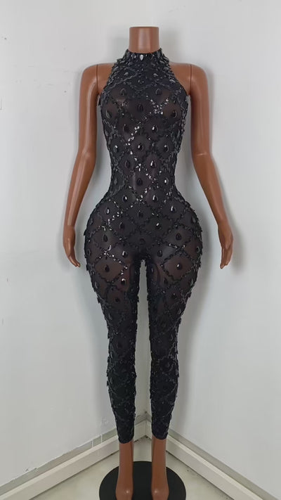 Step into pure seduction with this black sequin mesh jumpsuit. Designed to sculpt your curves and command attention, it features a sleek halter neckline and a form-fitting silhouette adorned with shimmering black sequins that catch the light with every move. Perfect for nightlife, performances, or special occasions, this piece is the ultimate blend of edgy glamour and unapologetic confidence.