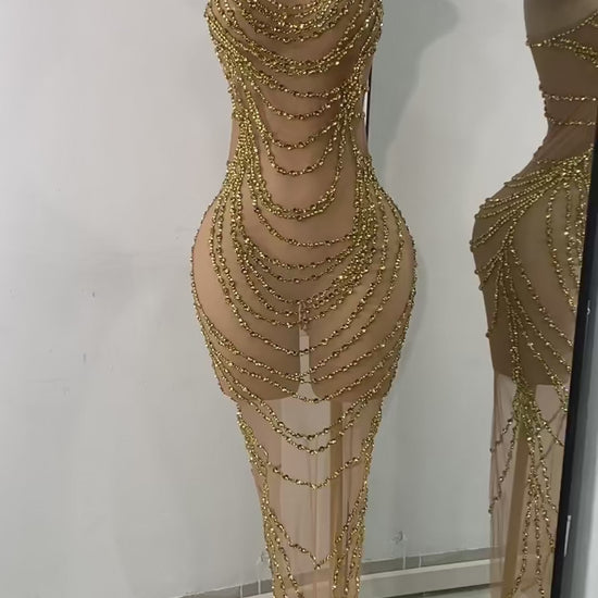 The dress is sheer and nude-toned, adorned with intricate gold beaded chains draped elegantly across the bodice, waist, and hips, creating a luxurious and sculpted silhouette. The high neckline is also embellished with gold beads, adding a regal touch.