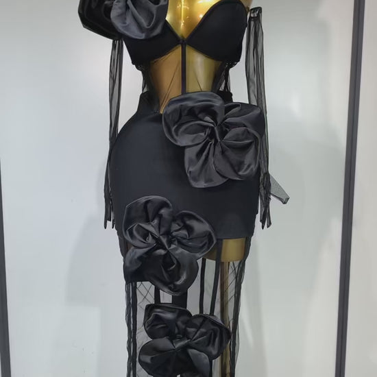 Command attention in our Midnight Bloom dress — a daring fusion of haute couture and gothic elegance. This sculpted black masterpiece features oversized satin floral appliqués, sheer paneling, sheer gloves and asymmetric design elements that make every angle a statement. Perfect for fashion-forward galas, red carpet events, or any night you plan to steal the show.