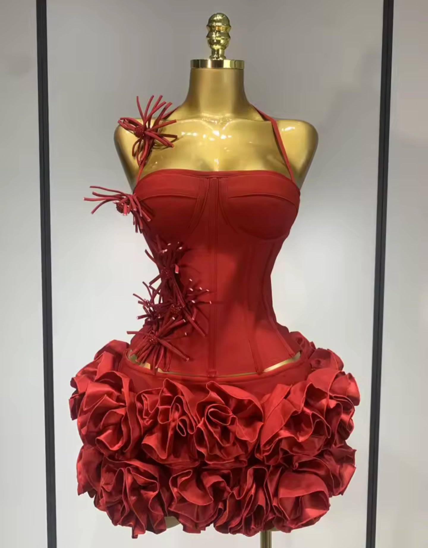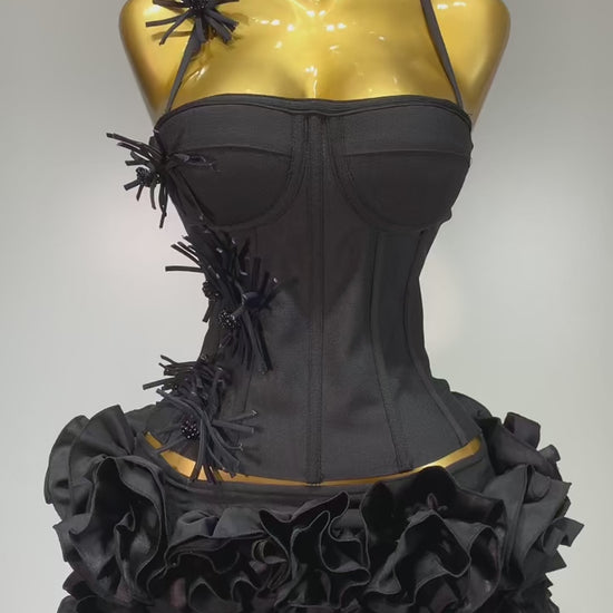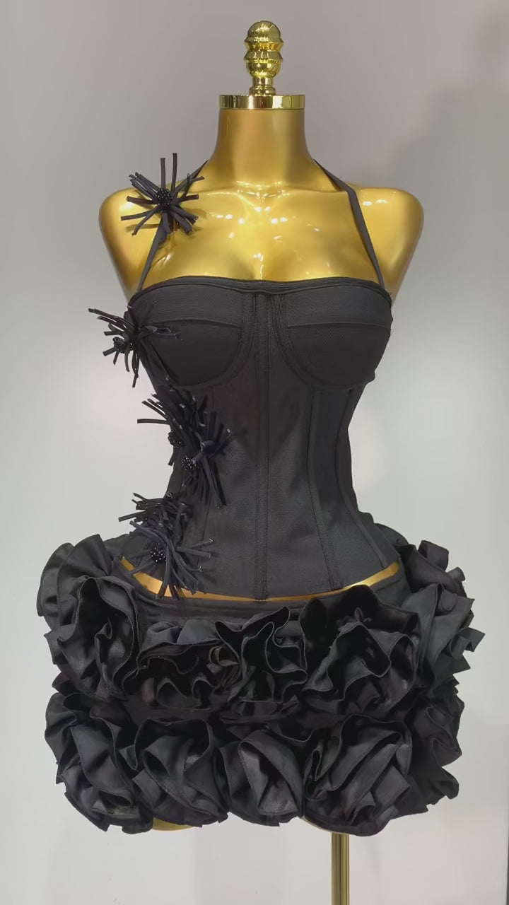 Unleash your inner femme fatale with the Midnight Dahlia Corset Skirt Set. Featuring a structured corset bodice with a halter neckline, edgy floral appliqués along the side, and a voluminous ruffled skirt, this piece is all about power and drama. Crafted in deep noir satin, it balances fierce structure with flirtatious flair—perfect for runway moments, elite soirées, or turning heads wherever you go.
