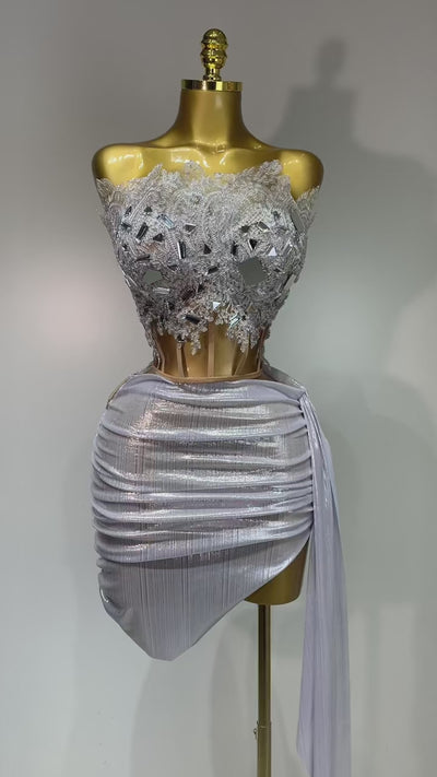 A breathtaking blend of edgy elegance and futuristic glam. The structured bodice dazzles with mirrored embellishments and intricate lace, giving the illusion of shattered glass artistry. Paired with a metallic ruched wrap skirt that hugs every curve, this look is pure sculpted sophistication. Perfect for fashion icons who shine without apology.