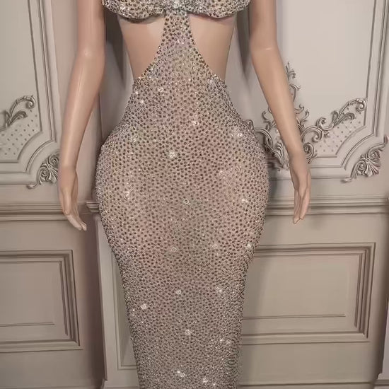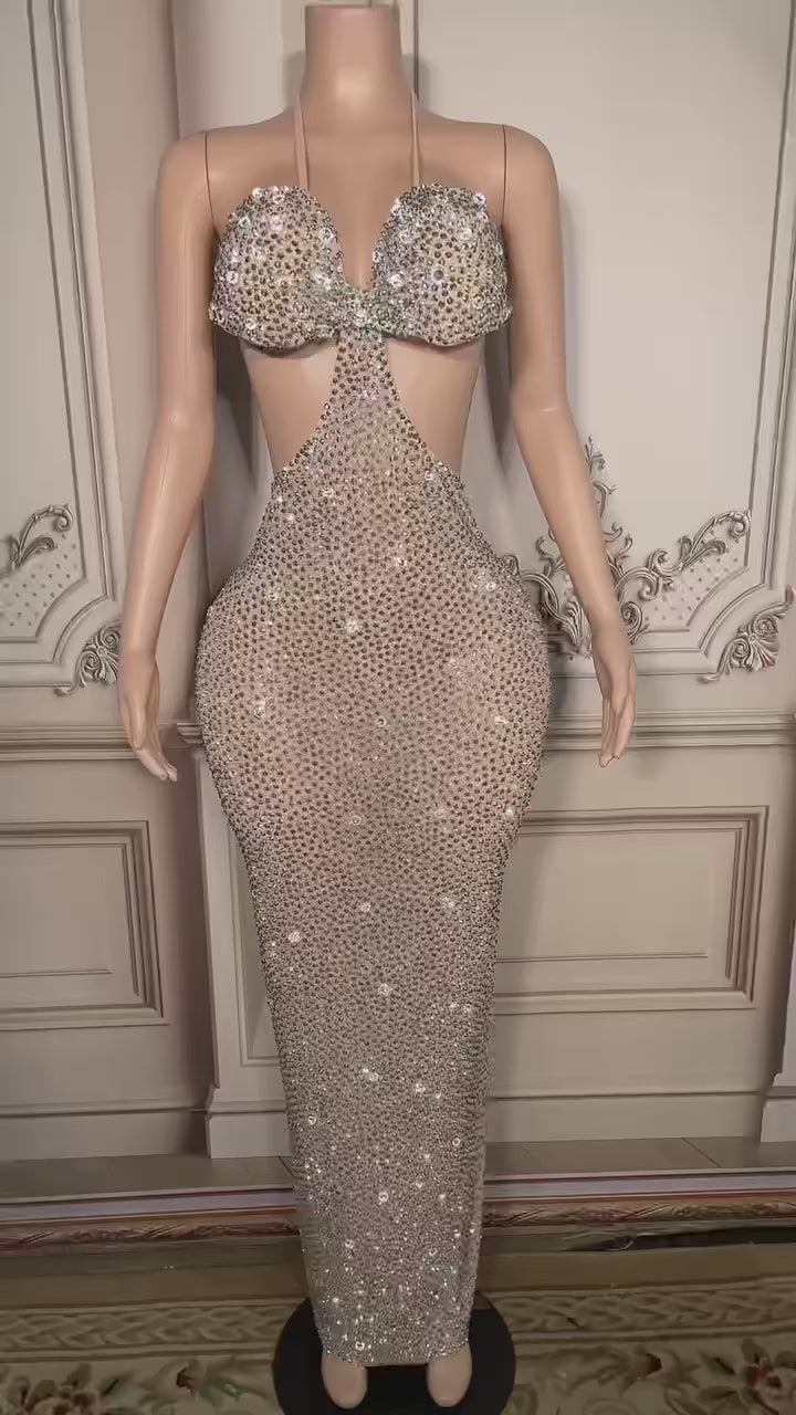 Turn every head in the room with this breathtaking full-length gown, meticulously hand-embellished with shimmering crystals. Featuring a daring plunge neckline, sculpted bust cups, and seductive side cutouts, this masterpiece hugs your curves and sparkles with every step.