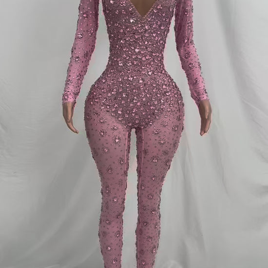 Own the room in the Pink Temptation jumpsuit — a seductive statement piece drenched in dazzling detail. Crafted from sheer blush mesh and covered in radiant pink crystal appliqués, this fitted one-piece is designed to contour your curves with precision. Featuring long sleeves, a dramatic high neckline, and a flirty keyhole cutout at the bust, it strikes the perfect balance between bold and sophisticated.