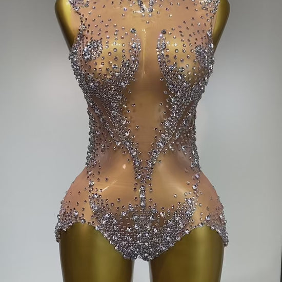 Sculpted to perfection, this crystal illusion bodysuit is the definition of modern glamour. Designed on a sheer nude base, it is adorned with hundreds of hand-placed rhinestones that create a radiant, body-contouring sparkle. The high-neck silhouette offers sophistication, while the crystal placement enhances curves with a luxurious shine. Perfect for performers, show-stopping entrances, or unforgettable nights, this piece commands attention with every movement.