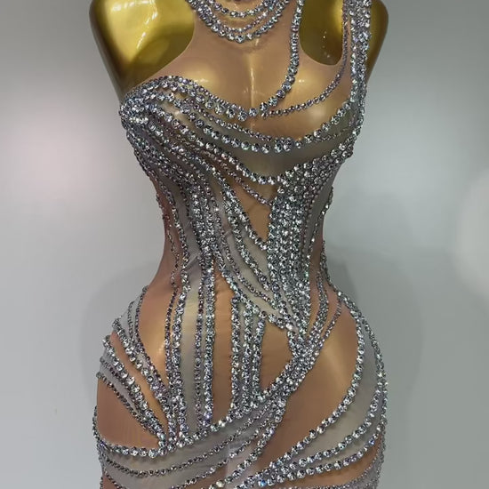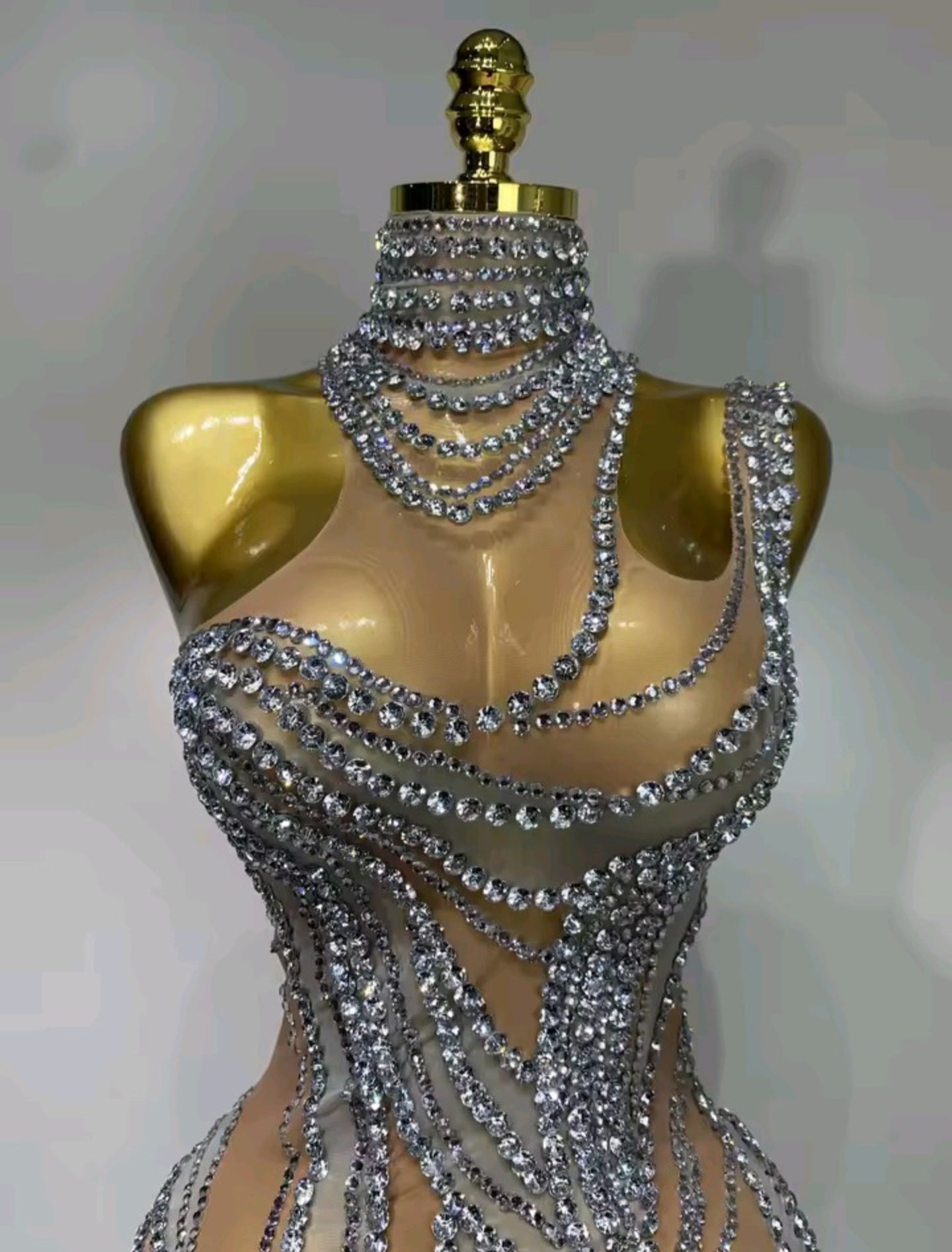 A dazzling illusion mesh dress adorned with cascading crystal rhinestones. This figure-hugging masterpiece features intricate, sculpted lines that highlight your curves and a high-neck choker detail that exudes luxury. Perfect for spotlight moments, this is your go-to for red carpet events, upscale parties, or unforgettable nights out. Command the glow. Own the glam. ✨