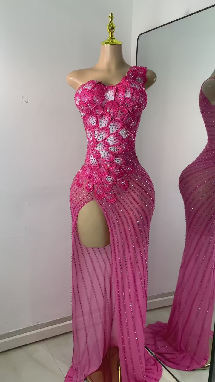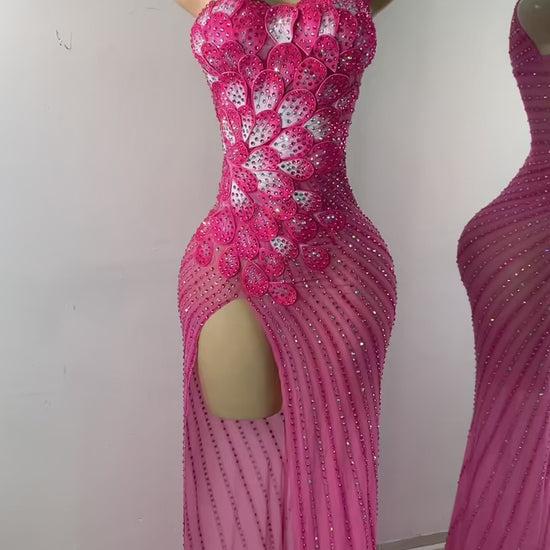 Unveil your inner goddess in our Rosé Radiance Dress — a dazzling fusion of floral artistry and seductive elegance. This floor-length showpiece features a sculpted bodice adorned with intricate petal-like embellishments that cascade into a sheer, rhinestone-streaked skirt. With a sultry high slit and a flattering one-shoulder detail, this dress is made for red carpet entrances, pageants, or luxe soirées. Step into the spotlight and bloom with power.