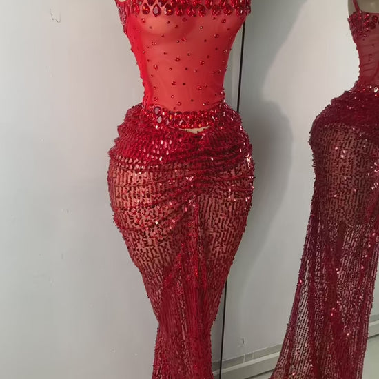 A daring fusion of fire and finesse. This figure-hugging masterpiece features a sheer, gem-studded bodice with a corset illusion that melts into a sea of blazing red sequins. The high-shine, curve-enhancing silhouette flares into a dramatic mermaid hem, making every entrance unforgettable. Made for the bold and the breathtaking.