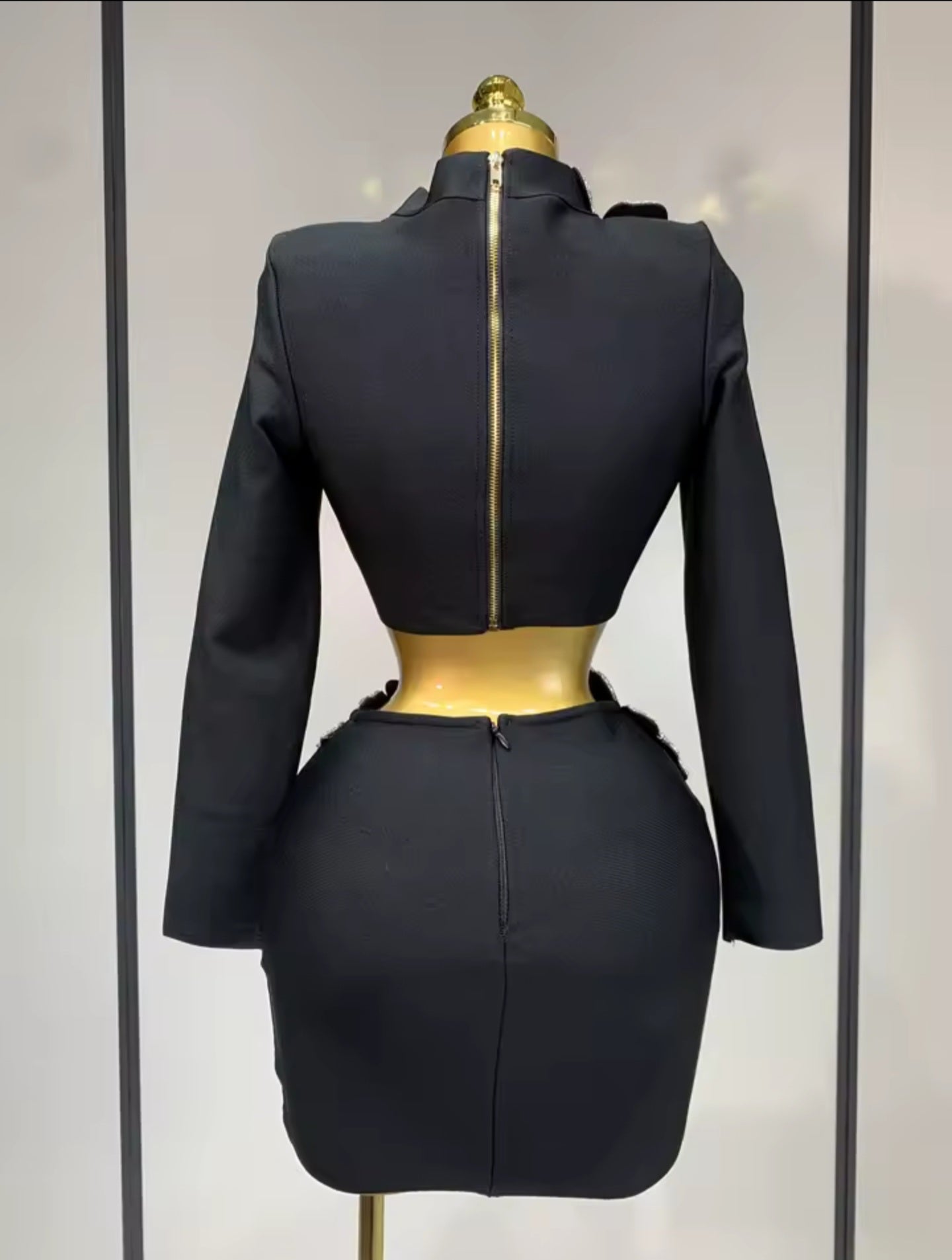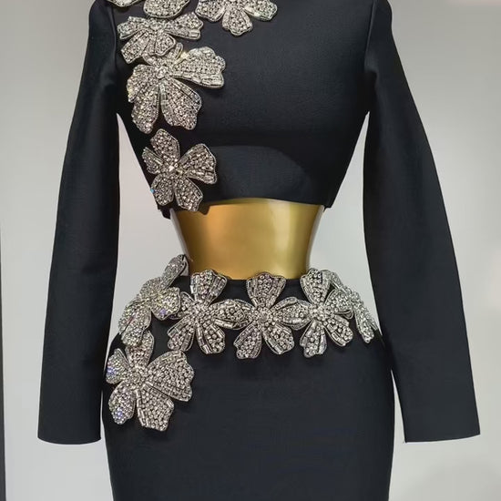 A striking black bodycon dress that redefines luxury with bold crystal floral embellishments. Sculpted to perfection with structured long sleeves and a daring waist cut-out, this piece is a true celebration of glam and power. The dramatic rhinestone florals cascade across the shoulder and hips, creating a captivating contrast of softness and strength. Perfect for upscale events, red carpets, or making your own runway moment.