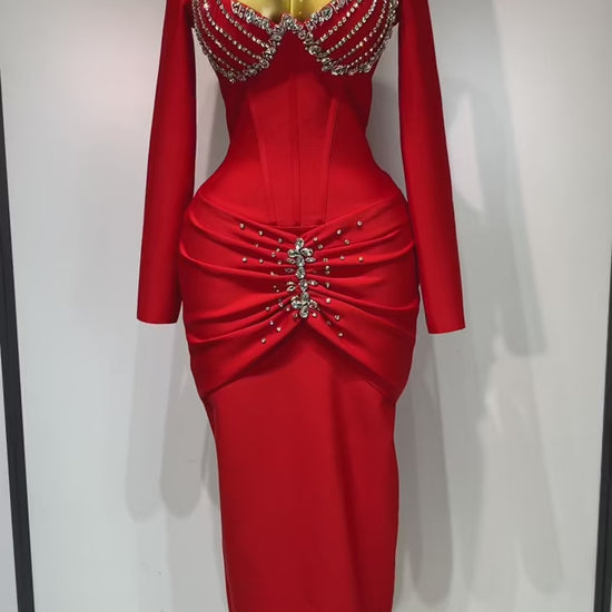 Unleash your inner femme fatale with our Ruby Vixen Dress—a fierce and figure-hugging masterpiece made for the spotlight. This deep red stunner features dramatic long sleeves, a sculpted waistline, and a crystal-embellished bustier that demands attention. The ruched skirt is crowned with jeweled accents, adding pure luxury to every curve. Perfect for high-glam events, birthdays, or when turning heads is the goal.