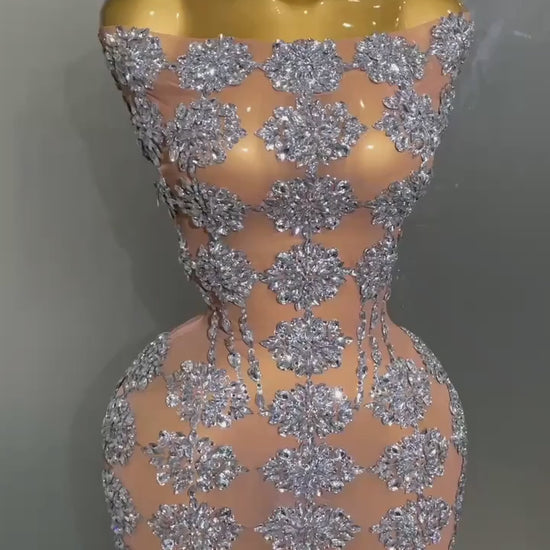 This stunning mini dress radiates seductive elegance and luxury. Crafted on a sheer nude mesh base, it’s artfully adorned with intricate, silver crystal appliqués arranged in floral-inspired patterns that strategically cover the bust, hips, and torso. This baddie screams luxury!