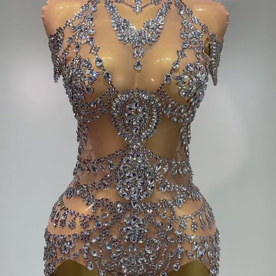 Turn every moment into a spotlight with this dazzling crystal-embellished bodysuit. Designed on a nude illusion base, it features intricate hand-placed rhinestones that create a sculpted, diamond-dripping effect. The high neckline and cutout detailing give it a couture edge, while the radiant shimmer makes it perfect for stage performances, luxury events, or unforgettable nights out. This show-stopping piece embodies pure glamour, exuding confidence and allure with every sparkle.