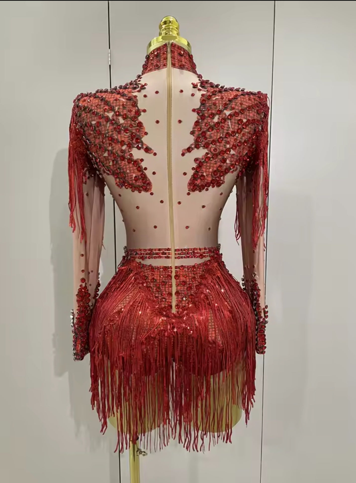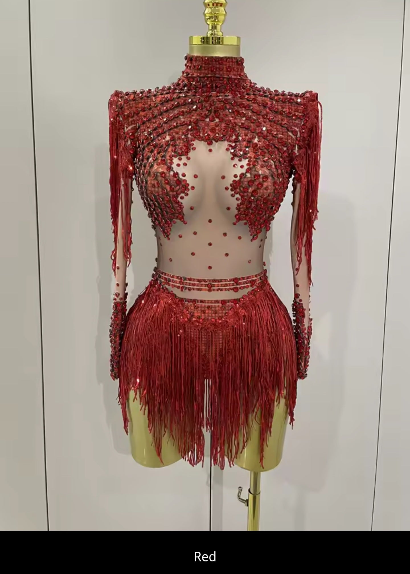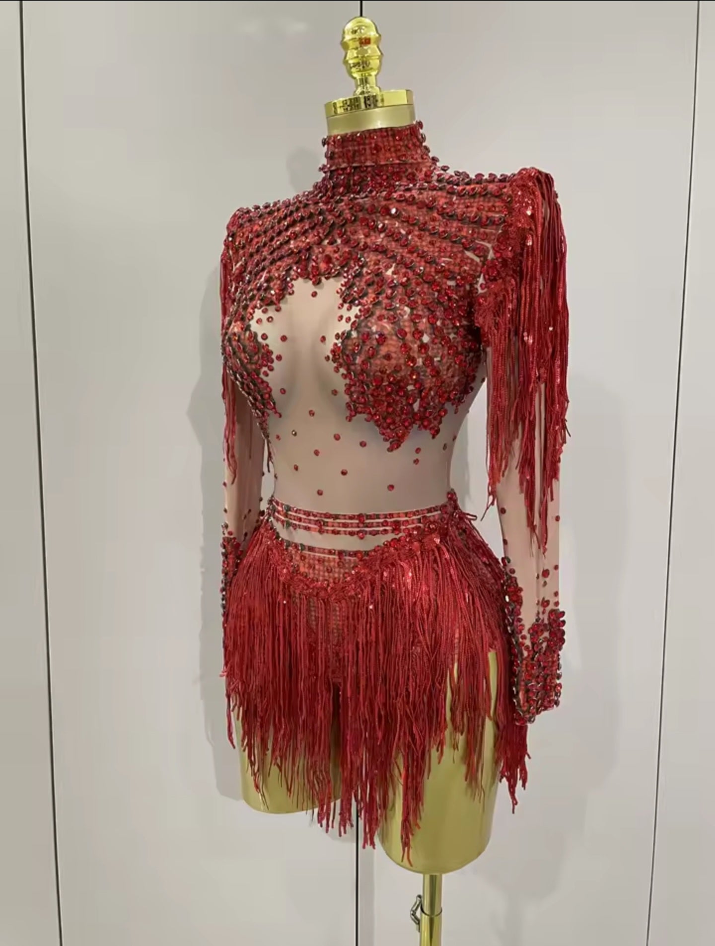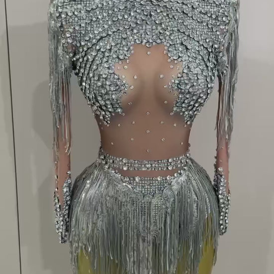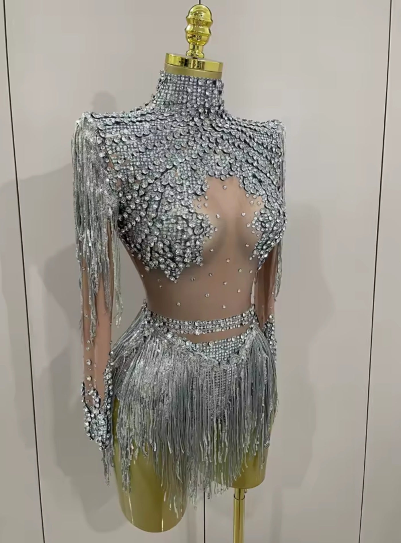 Sparkle and shine in our Vogue Diamond Playsuit, adorned with crystal fringe layers and shimmering gems. Take a daring leap and stand out with this show-stopping piece. It's the perfect combination of luxurious and bold, sure to make a statement at any event.