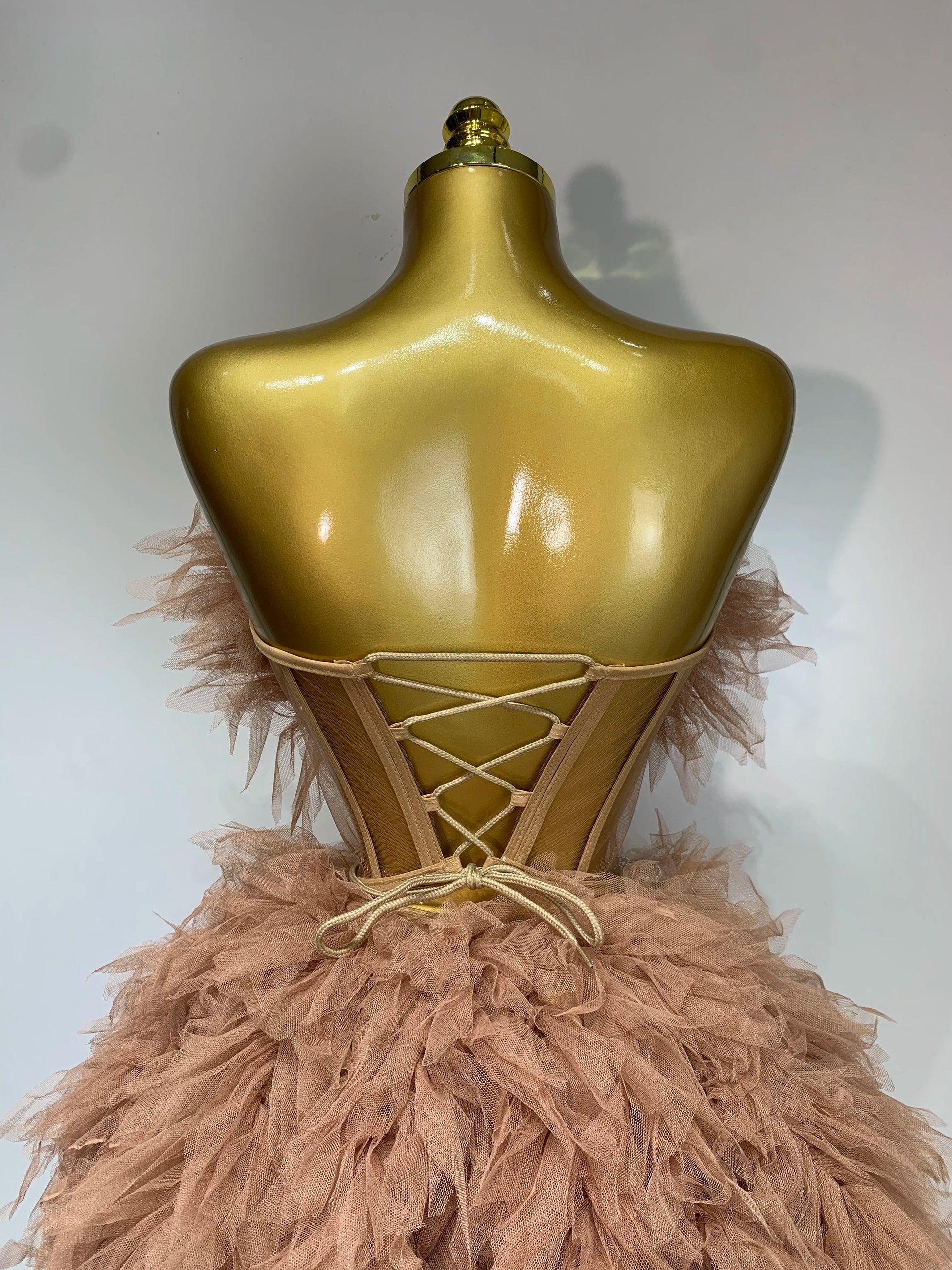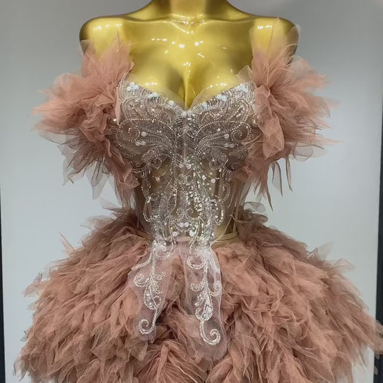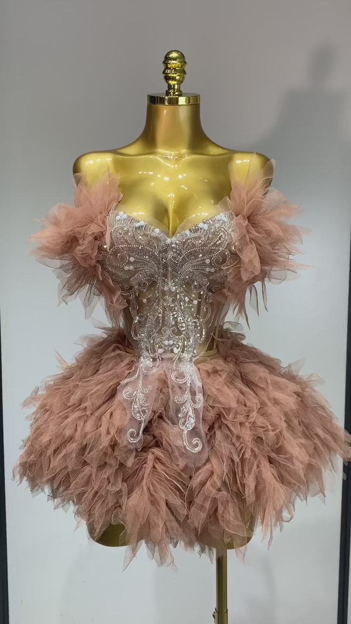 Float into the spotlight with our Blush Feather Fantasy Set— a masterpiece of dreamy texture and couture sparkle. This romantic design features a corset-style bodice adorned with intricate crystal beadwork and delicate embroidery, sculpting an enchanting silhouette. Layers of soft blush-toned feathers create a playful yet luxurious skirt and off-shoulder detailing, adding volume and dramatic flair. Perfect for upscale cocktail parties, fashion-forward soirées, or unforgettable birthday moments, this piece is pure statement glamour with a fairytale twist.